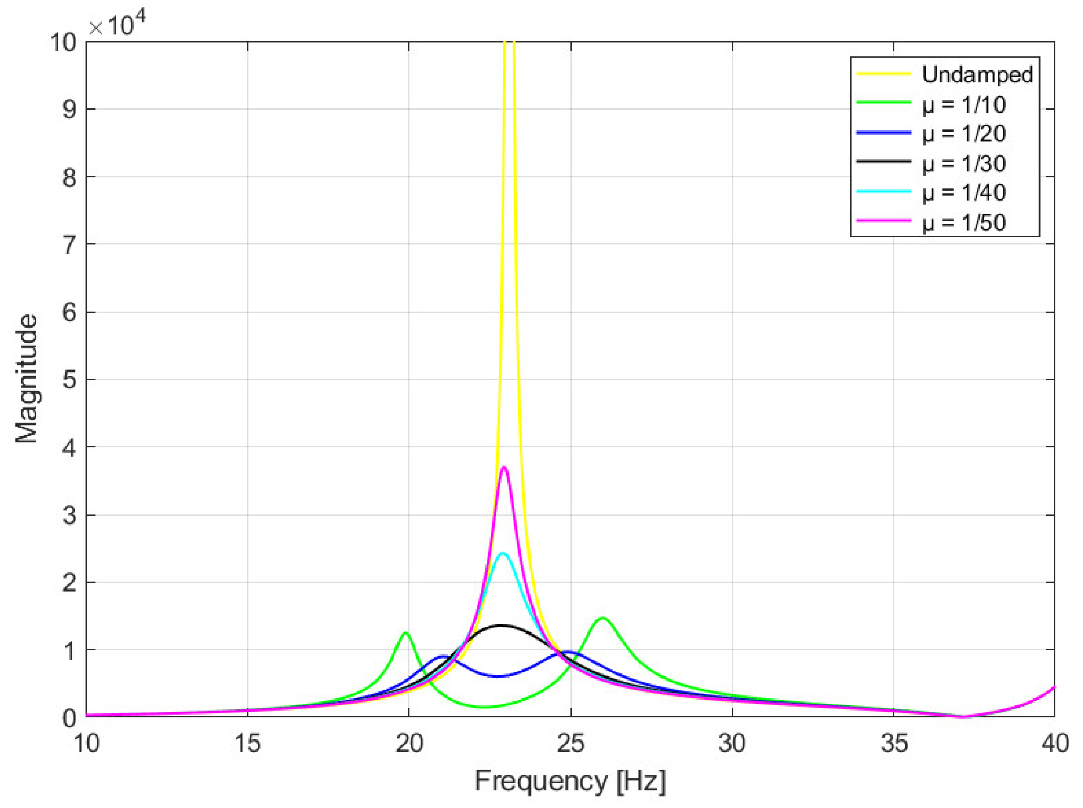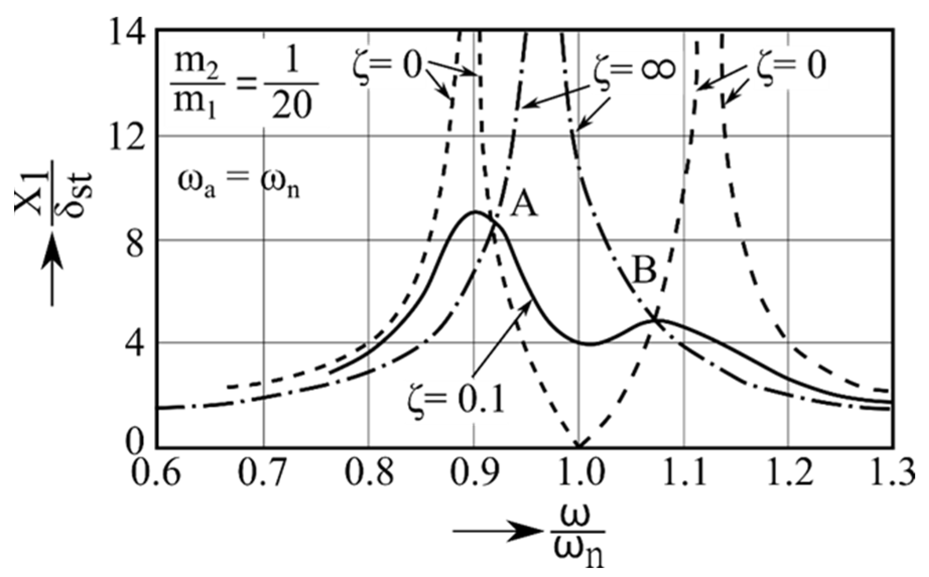 Equation (5) can be plotted with the normalized angular displacement magnitude on the vertical axis and the frequency ratio g on the horizontal axis, as shown in Figure 11. The results confirm that the properly tuned TMD reduces the amplitude at the original natural frequency, although it introduces two new resonance peaks on either side. Increasing the damping ratio ζ decreases the magnitude of both peaks.