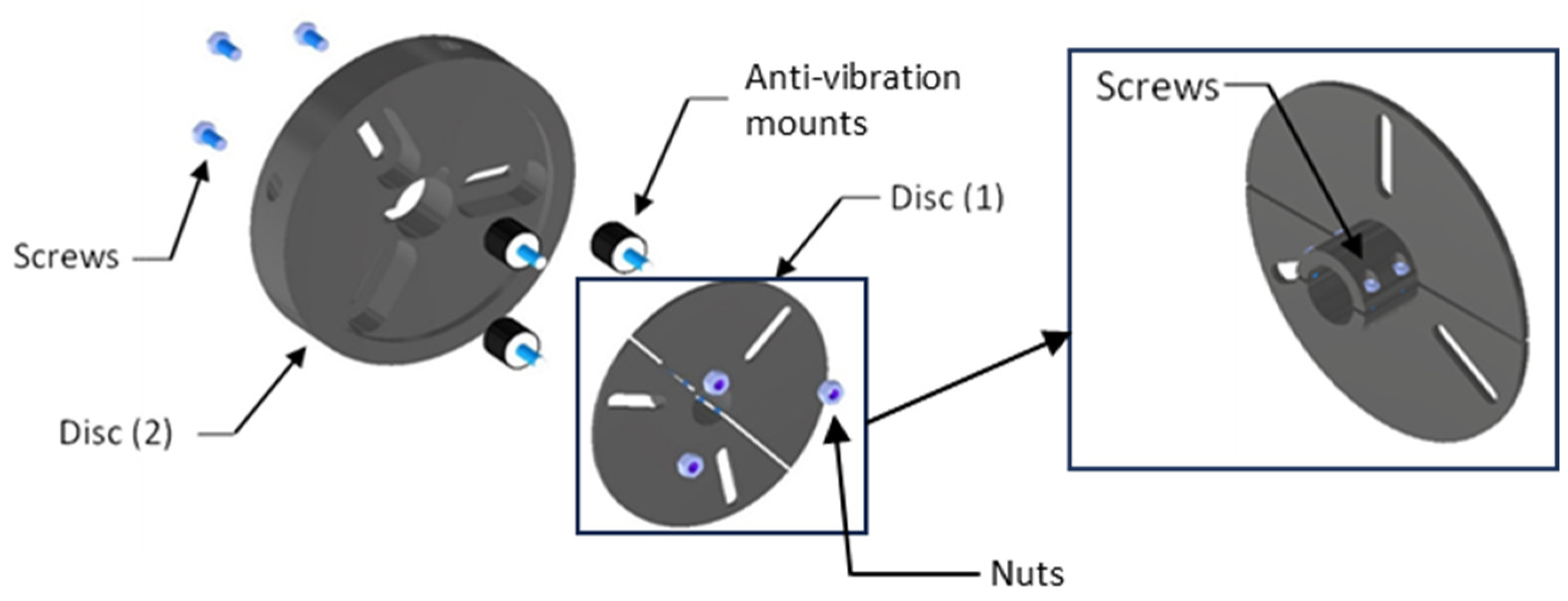 A double-disc configuration was adopted to achieve a compact and robust design. One disc provides shaft keying, while the other delivers the required rotational inertia. Disc (1) is manufactured in two halves and ensures shaft keying through friction when fastened with four screws. Disc (2), also split into two sections for assembly, supplies the necessary inertia. Both discs are machined with slots to accommodate the anti-vibration mounts.