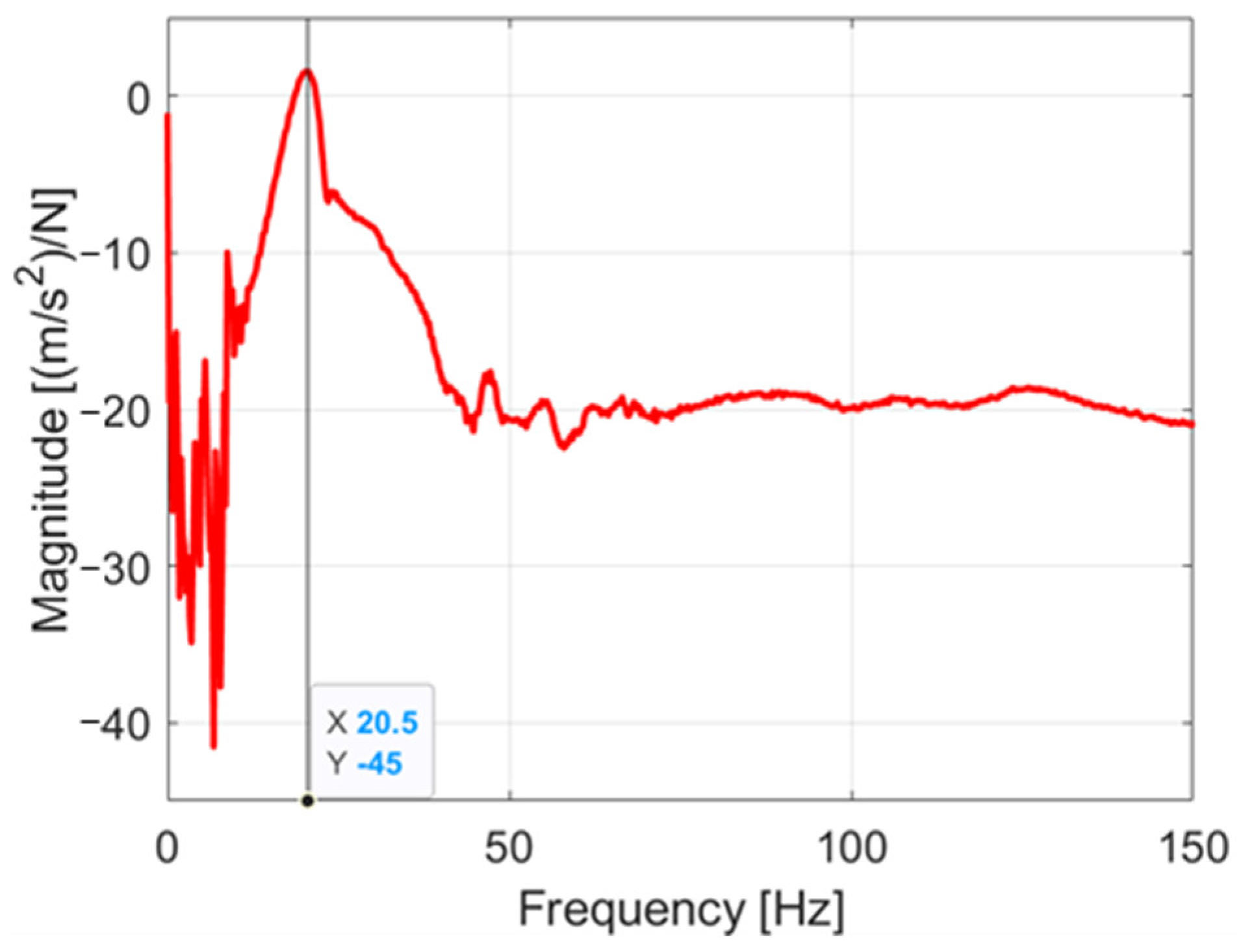 While the controller affects the torque profile post-impact, the possibility that the observed behavior is primarily caused by excitation of a torsional rotor resonance cannot be excluded. To investigate this, an experimental modal analysis was conducted. The typical frequency response function (FRF) test was performed, as shown in Figure 3a. The structure was excited using an instrumented hammer, while an accelerometer was mounted at the trailing edge of the blade near its tip. Specifications of the sensors employed are reported in Table 1 and Table 2.