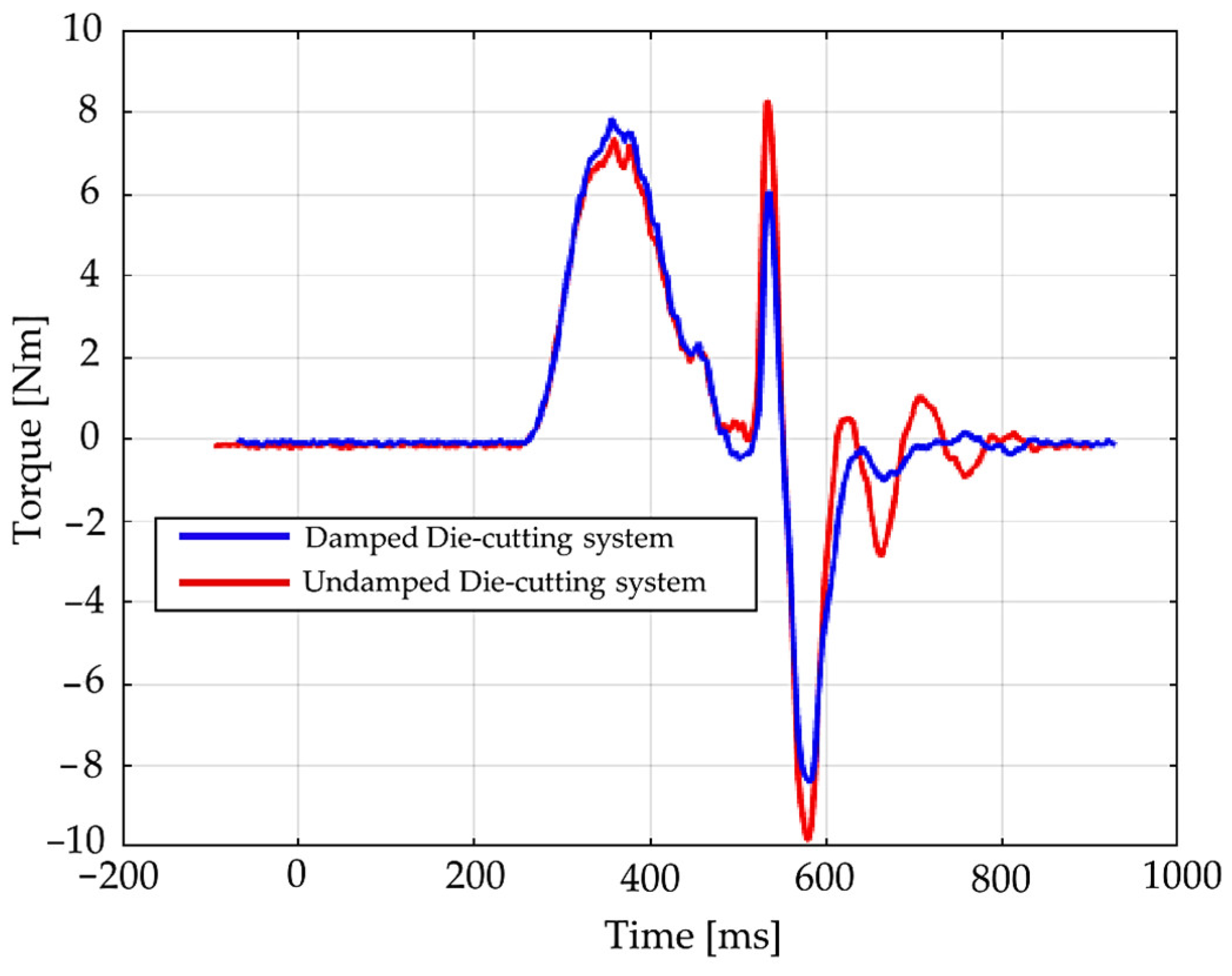 The first torsional eigenfrequency of the rotor corresponds exactly to twice the oscillation frequency of the torque observed in Figure 2. Therefore, the excitation of the first torsional resonance of the die-cutting system is identified as the primary cause of the damaging vibrations, highlighting the need for a damping solution to mitigate its effects.