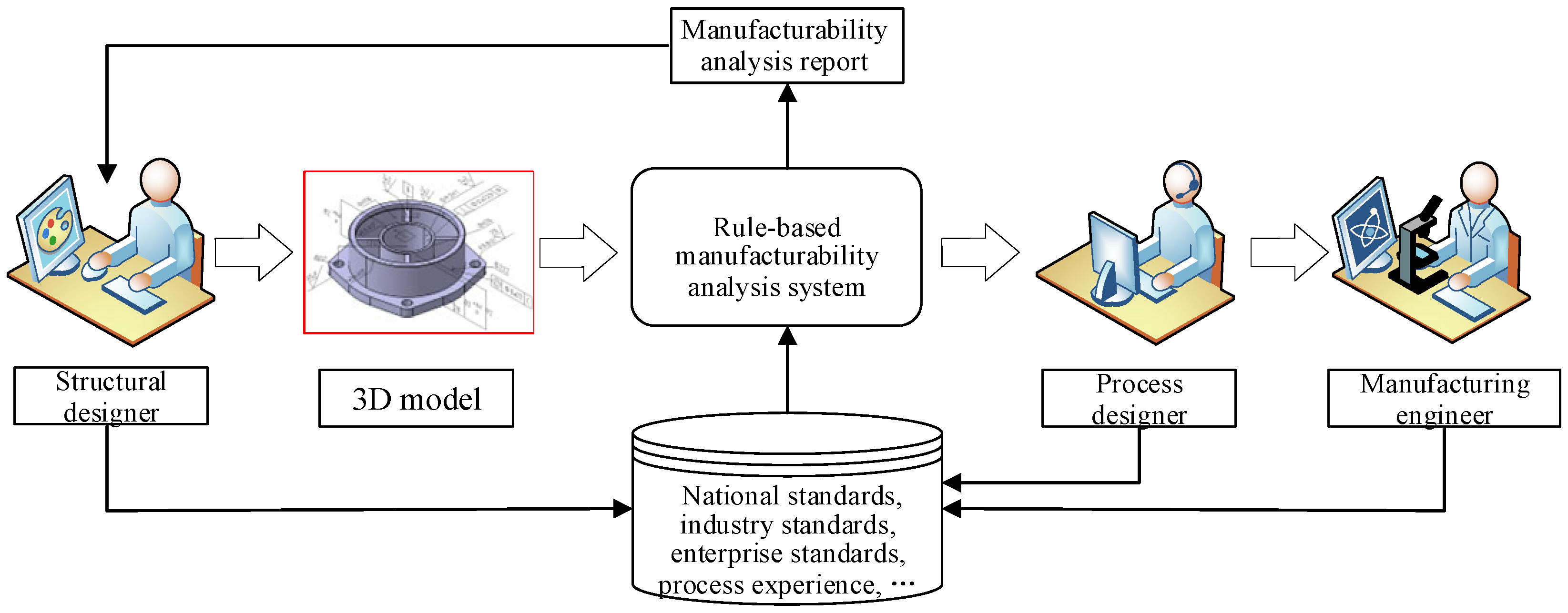 At present, rule-based manufacturability analysis systems are also being deployed and applied by enterprises. As shown in Figure 1, the idea is to construct a manufacturability analysis rule repository based on standards formulated at all levels, such as national standards, industry standards, or enterprise standards, as well as the process experience accumulated by structural designers, process designers, and manufacturing engineers. The system performs manufacturability analysis on the designed 3D model through rule reasoning and generates an analysis report. Structural designers modify the design model based on the feedback analysis report [1,2]. The system has achieved good application results in the case of product type determination. However, products are currently being diversified, which will require a more complete rule repository. However, it is difficult to construct a complete rule repository, and it results in a heavy reliance on experienced process designers. Therefore, this method still cannot solve the problems existing in the manufacturability analysis process of the above-mentioned enterprises. The data-driven method achieves various tasks by mining implicit knowledge in the data, reducing the reliance on professionals, and having better flexibility. At present, the application of deep learning to the design or manufacturing field is becoming popular, such as part classification [3], engineering drawing recognition [4], machining feature recognition [5], machining parameter prediction [6], machining process planning [7], manufacturing cost estimation, etc., and has achieved good results. However, the application of deep learning in the field of manufacturability analysis is still less studied. It is mainly aimed at simple parts with single features or general databases, which is difficult to apply in practice. At the same time, most methods use voxels or point clouds to represent 3D geometry, which result in a large amount of data processing and easily lose the topological information of the parts and the accuracy requirement information, etc., resulting in a poor application effect when dealing with complex parts.