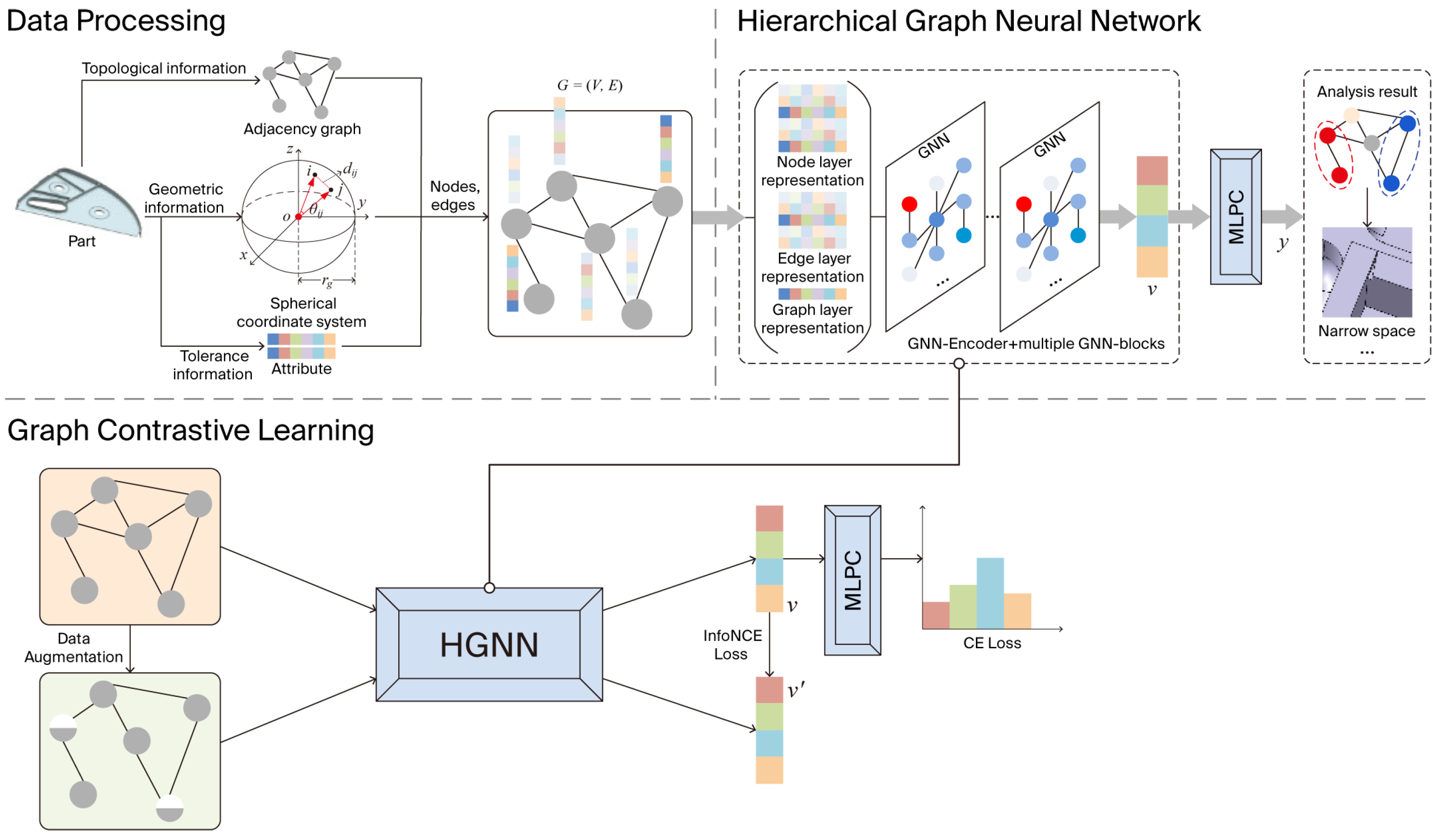 Based on the above background and requirements, a manufacturability analysis method based on graph neural networks is proposed. First, the attribute adjacency graph and UV gridding are combined to characterize the part model data, which can effectively represent the topological and geometric information on the part model. At the same time, the parameter information on the spherical coordinate system is used to ensure rotation and translation invariance; then, based on the graph representation of the part model, a hierarchical graph neural network is constructed, which is divided into three levels, edge, node, and graph, for encoding, information transmission, and updating. The receptive field is expanded for better node classification to support manufacturability analysis. Finally, in the pre-training stage, graph contrastive learning is used as a regularization technique to maximize the similarity of graph representations between different views and improve prediction performance. The effectiveness of the proposed method is verified through experimental tests.