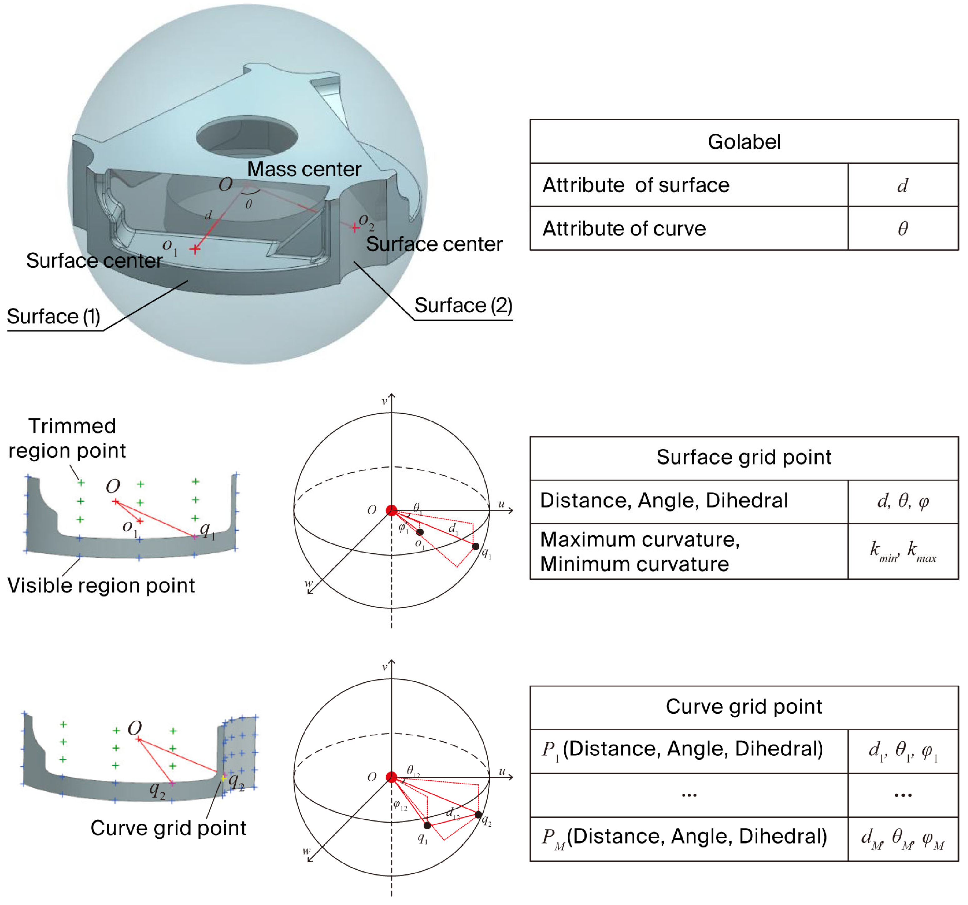 After the overall geometric representation, the relative position of the face in the geometric body is determined, and it is also necessary to represent the geometry of the face itself and the geometric relationship between the faces in order to fully represent the geometric information. The faces in the 3D model are divided into geometric faces and topological faces. The topological faces represent the connection relationship between geometric elements, and the geometric faces contain geometric information. Among them, the geometric face can be further represented by the UV grid, that is, the discrete parameterized representation. For example, the geometric face F(u, v) can be represented by the parameter domain [umin, umax] × [vmin, vmax]. Furthermore, the 3D geometric face can be represented in the 2D parameter domain through 2D sampling with a step size of s = (umax umin)/(M − 1), where M is the number of samples in a single direction. The parameter domain can completely surround the face and divide it into a visible region and a trimmed region. The visible area is inside the entity, and the trimmed area is the part outside the entity within the parameter domain. Thus, at each grid point (k, l), we attach the following local features encoding the geometry of the surface as channels: (a) Distance, angle, and dihedral, representing the geometric position. The encoding requires normalizing the geometry into a sphere with a radius of 1, with the center of the sphere as the center of mass and the UV direction as the base direction, and then calculating each value, as shown in Figure 3. (b) Maximum curvature and minimum curvature, representing the geometric shape. (c) A flag bit with a value of 1 or 0, indicating whether the sampling point is in the visible region or the trimmed region.