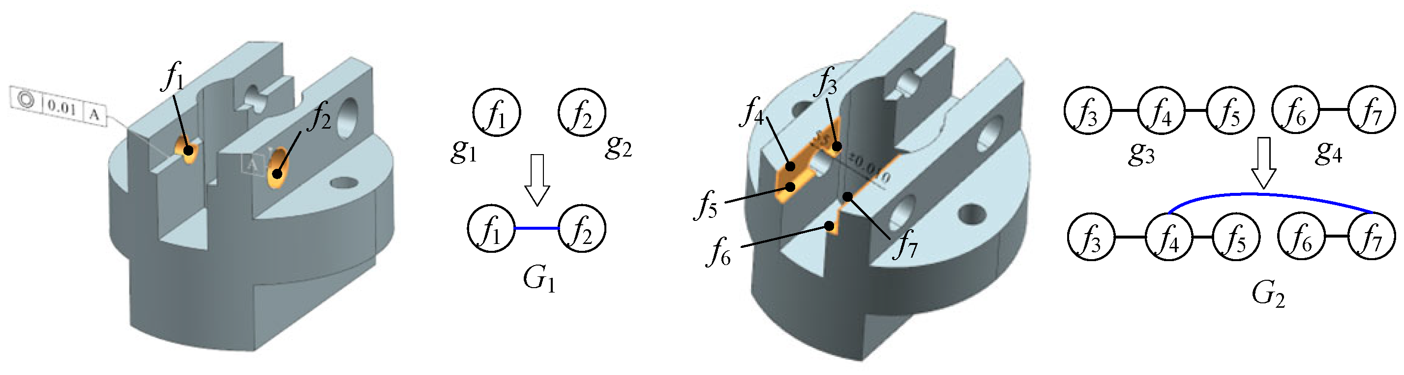 Tolerance information mainly refers to accuracy requirement information, that is, the tolerance requirements marked, which include dimensional tolerance, form and position tolerance, and roughness. From another perspective, accuracy requirement information is divided into those associated only with the machining surface itself and those associated with multiple machining surfaces. The marking of tolerance requirements is related to geometry, and the geometry of the machining surface (such as size) affects machinability and economy. In addition, there are also relationships between tolerances, such as that the geometric tolerance grade is higher than the dimensional tolerance grade. In the MBD model, tolerance marking is associated with low-level geometric elements such as points, lines, and surfaces. In order to better represent the data, it is necessary to further associate it with the two-level elements of face and edge. At the same time, when there are the tolerances with datum or other tolerances associated with multiple machining surfaces, this type of association relationship does not have pure geometric information, but expresses high-level design intent. In order to better express this type of association relationship, the concept of semantic edges is introduced, and the original attribute adjacency graph constructed based on geometric elements is optimized by adding semantic edges. As shown in Figure 4, there was no edge between f1 and f2. Since the machining surface f1 is marked with coaxiality based on f2, the originally independent surfaces f1 and f2 are directly connected by constructing semantic edges. There are dimensional tolerances between surfaces f3, f4, f5 and surfaces f6, f7, and a closer relationship between these surfaces is constructed through semantic edges. Similarly, in 3D design software such as CATIA and UG, the tolerance annotation information in the MBD model can be obtained through its underlying functions. The specific tolerance information is shown in Table 2.
