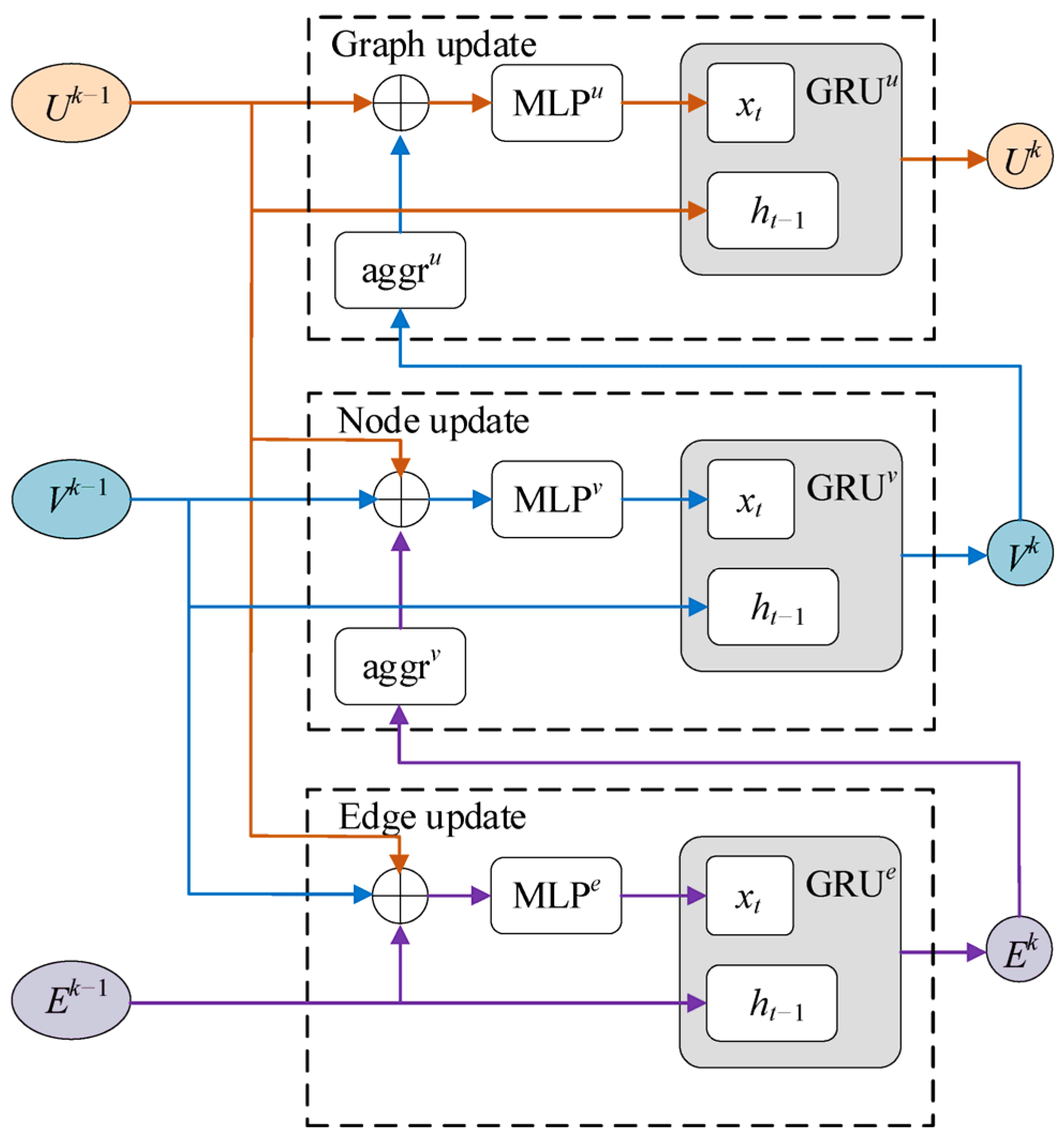 In order to expand the receptive field, our method stacks multiple GNN blocks. In this way, distant edges or nodes can influence each other, thus achieving a stable representation. Each GNN block updates the edge, node, and graph feature vector in turn, as shown in Figure 5.