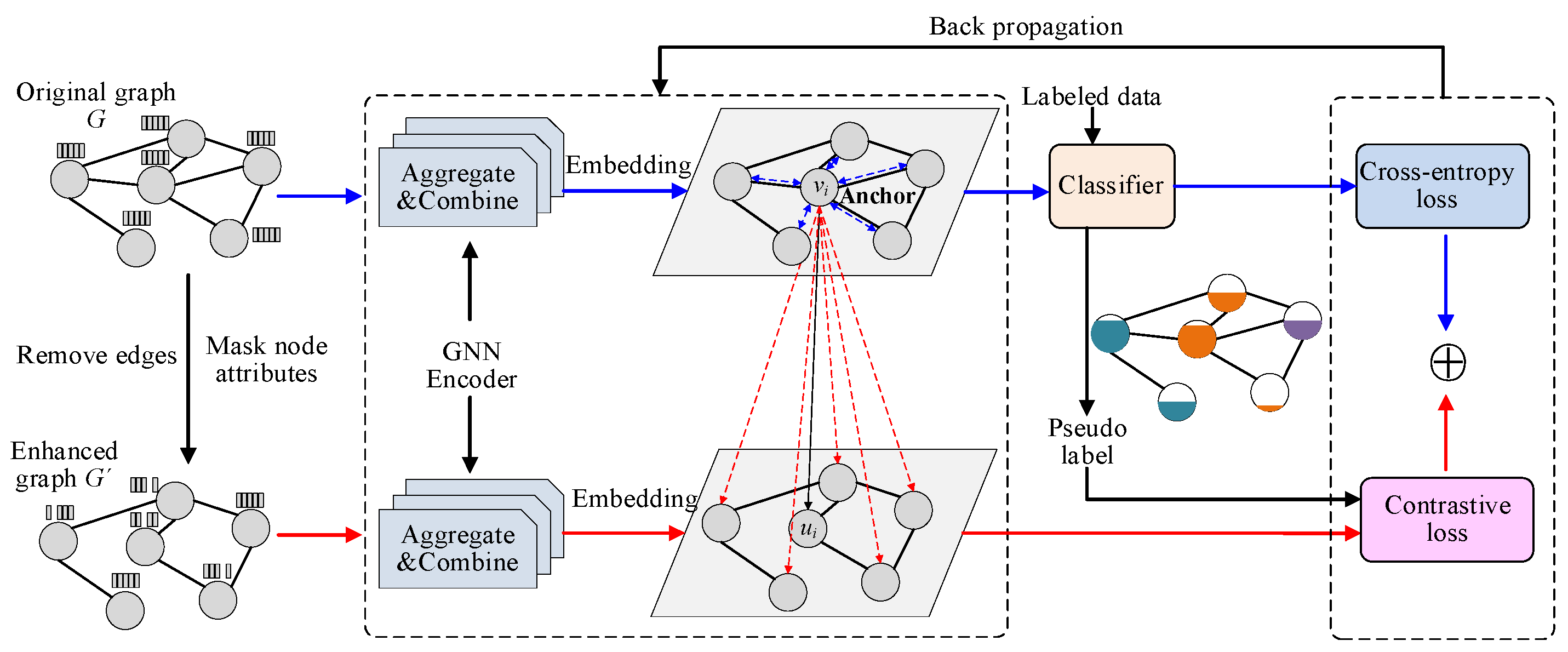 Contrastive learning has achieved good results in graph data pre-training and unsupervised learning. The essence of using contrastive learning methods in graph structures is to generate two views of the same sample through data augmentation, and then maximize the similarity between their encoded representations, which provides great help for pre-training. As shown in Figure 6, the specific idea is as follows: First, based on the original graph, an enhanced graph is generated by removing some edges, masking some attributes of nodes, or injecting noise. The nodes in the original graph and the enhanced graph are encoded to obtain node embeddings; the model is trained with labeled data, and pseudo labels are predicted for unlabeled data; and pseudo labels are used to guide the construction of positive and negative samples within or between views; in this way, the cross entropy error obtained from the original graph and the contrast error obtained from the contrast process are combined to provide feedback and optimize the parameters of the model.