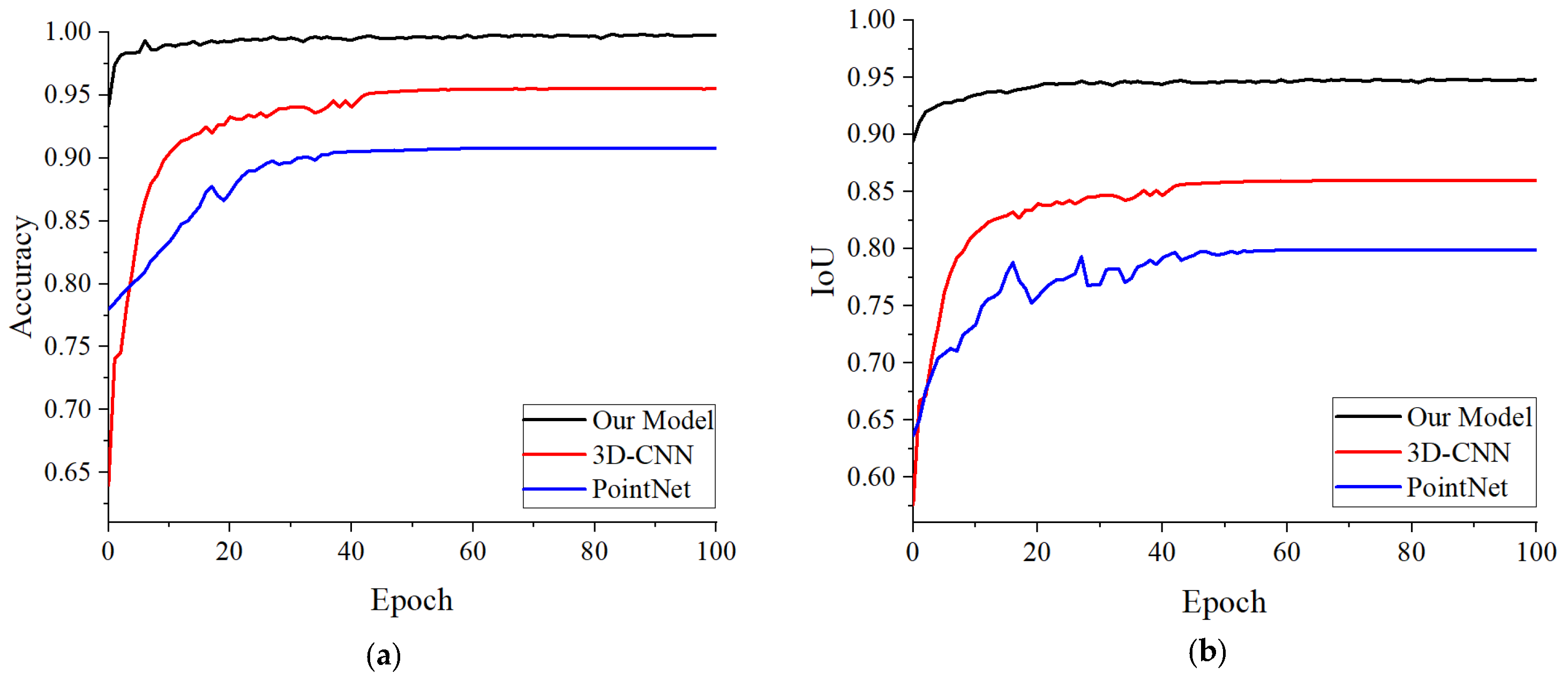 Figure 9. Accuracy and IoU curves of part model validation set. (a) Accuracy curve (Our model is represented in black, 3D-CNN in red, and PointNet in blue). (b) IoU curve (Our model is represented in black, 3D-CNN in red, and PointNet in blue).