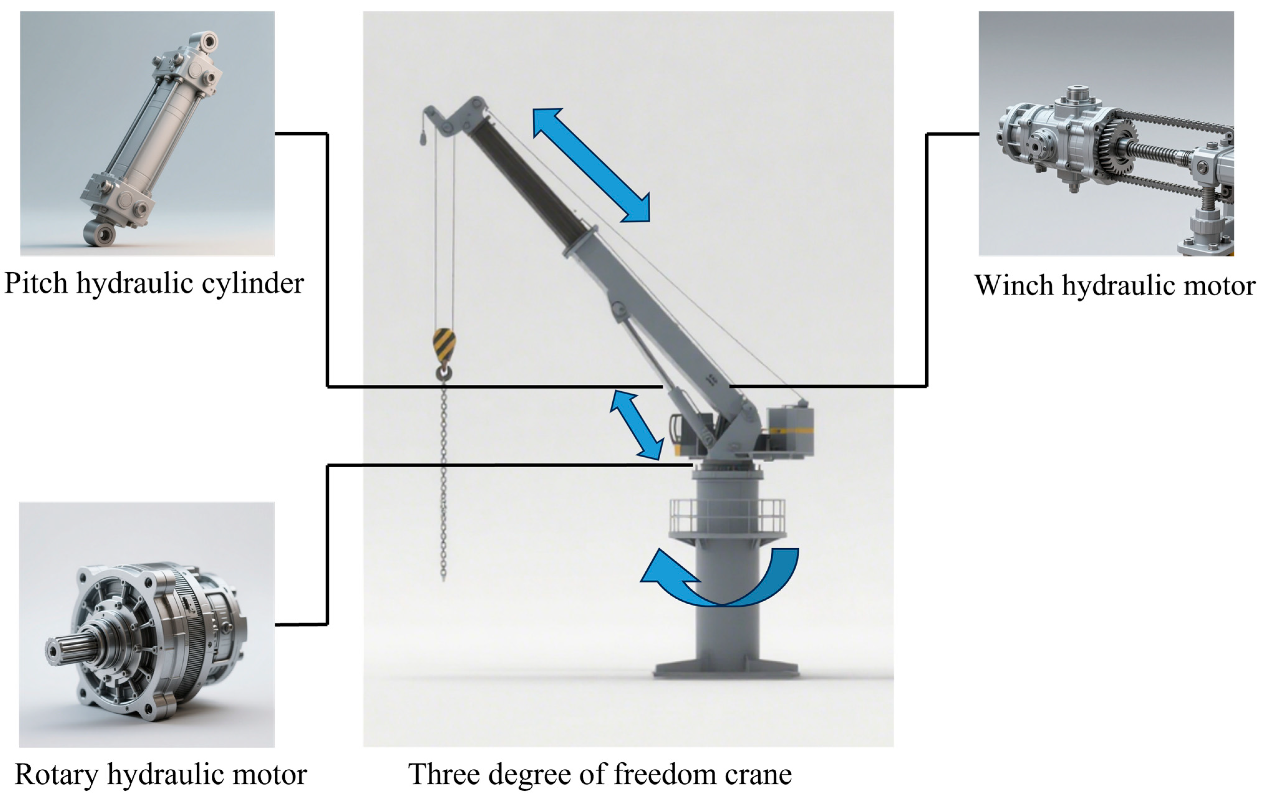 1]. In controlling critical 3-DOF crane movements—pitch, rotary, and winch—traditional hydraulic systems have increasingly revealed limitations including inadequate control precision, response lag, and high system complexity. During precision winch operations, traditional systems fail to achieve precise positioning of lifting height and rotary angle, resulting in significant load swing and elevated operational risks. Under complex operating conditions, the response delay of pitch movements impairs crane operational efficiency and stability [
