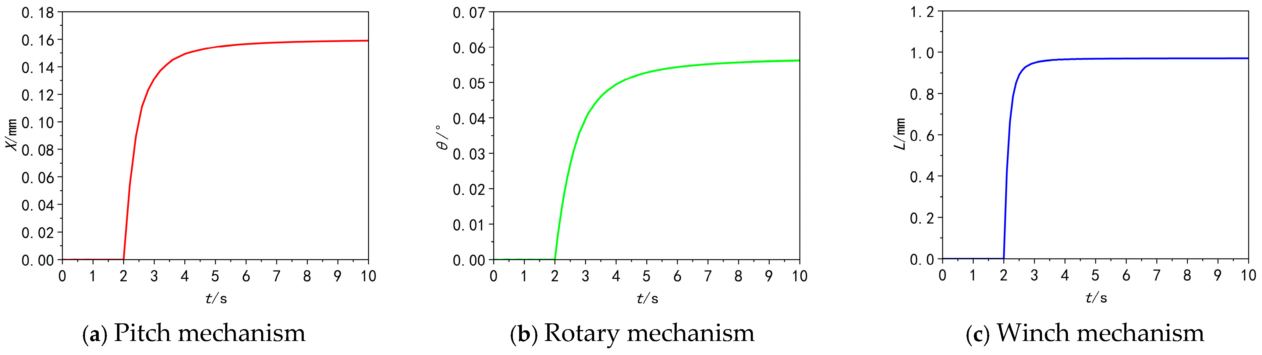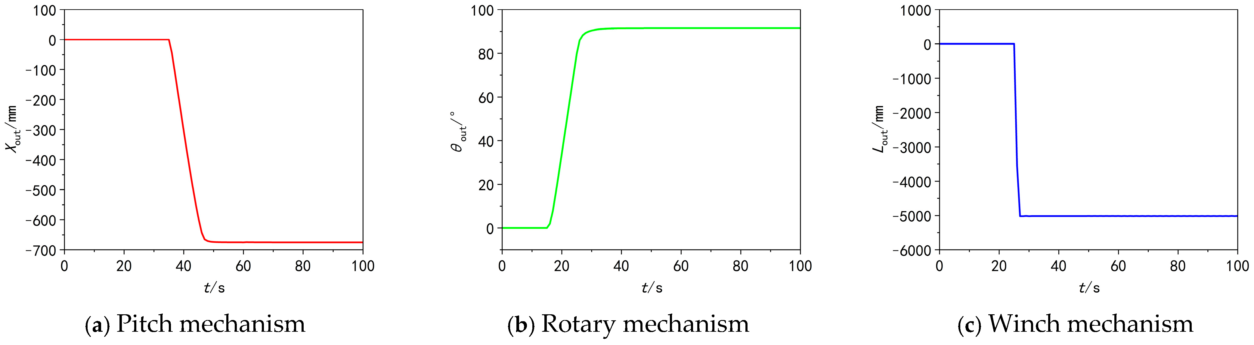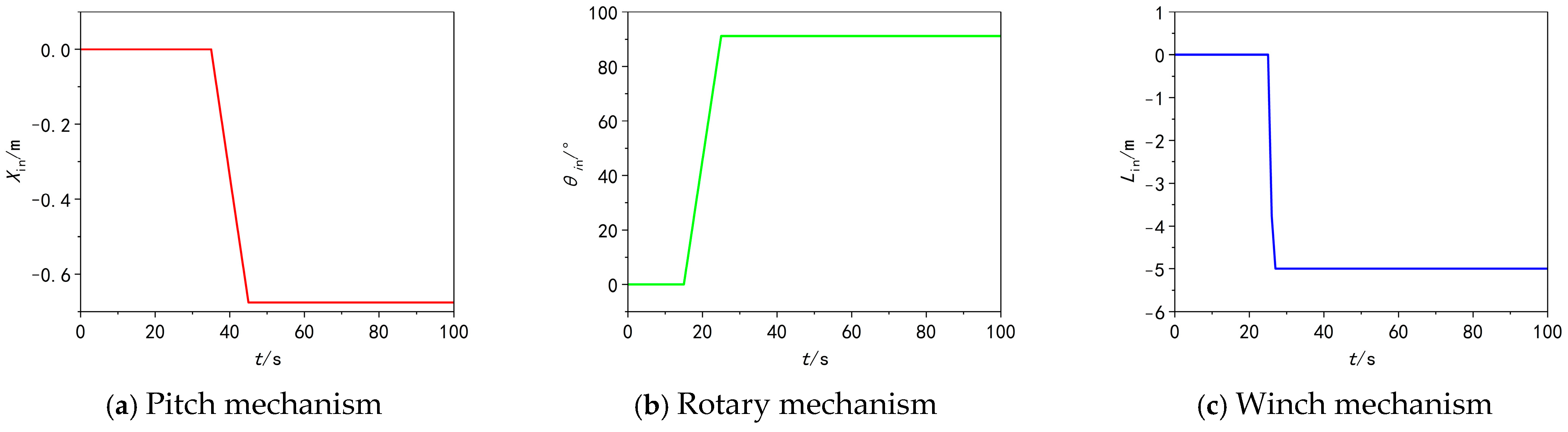 To simulate real working processes, position command timings and operation paths are precisely defined: pitch mechanism (35 s command, 0 m to −0.675 m in 10 s); rotary mechanism (15 s command, 0° to 91.2° in 10 s); winch mechanism (25 s command, 0 m to −5 m in 1.33 s).The simulation step size is set to 0.001 s, and the input position signals are shown in