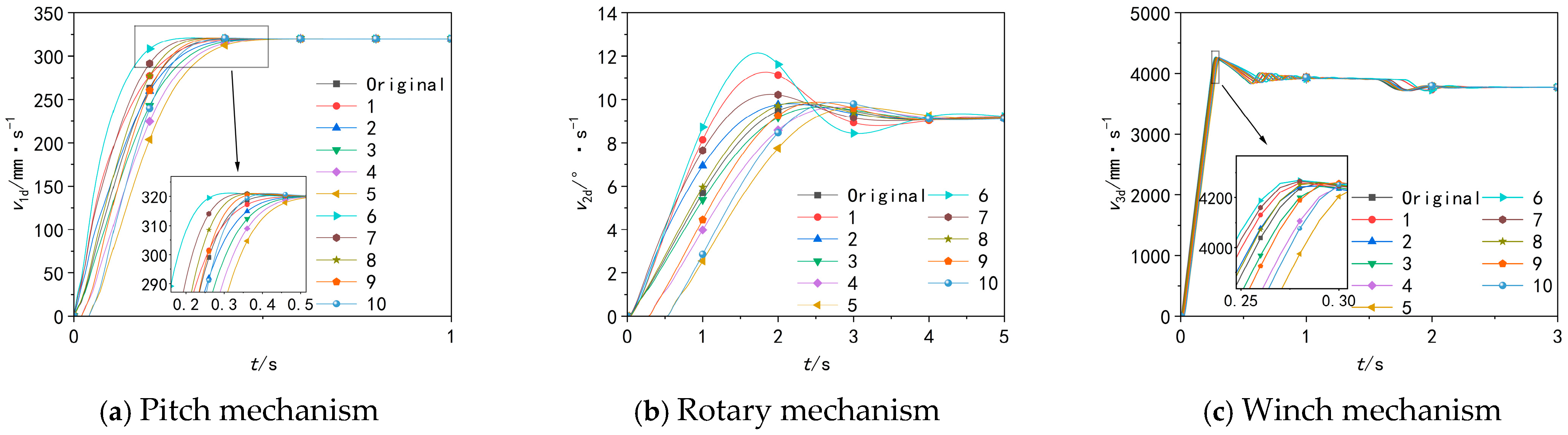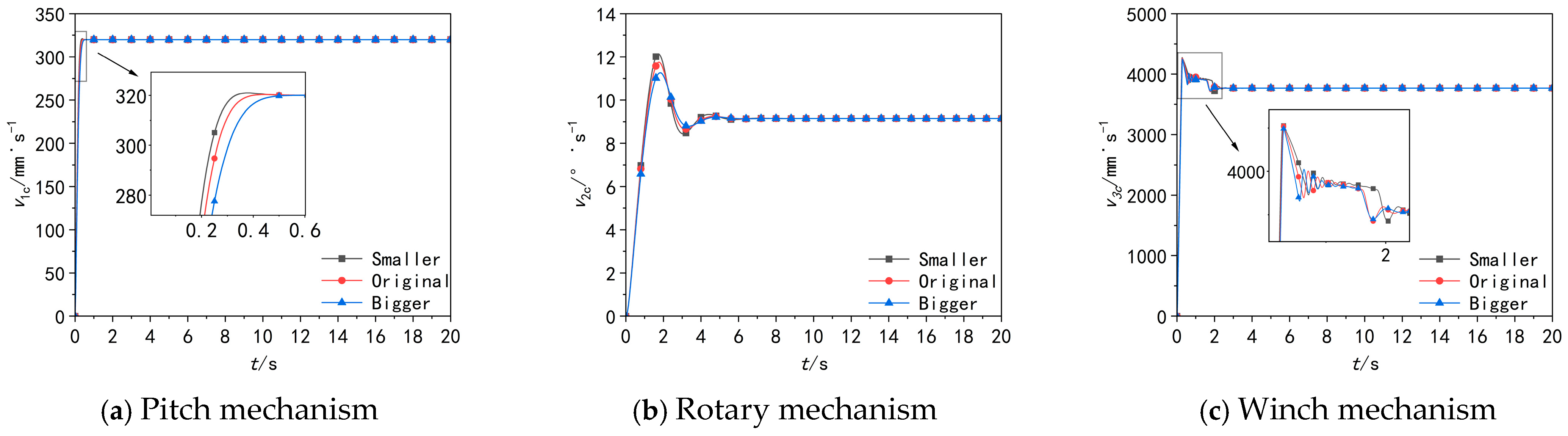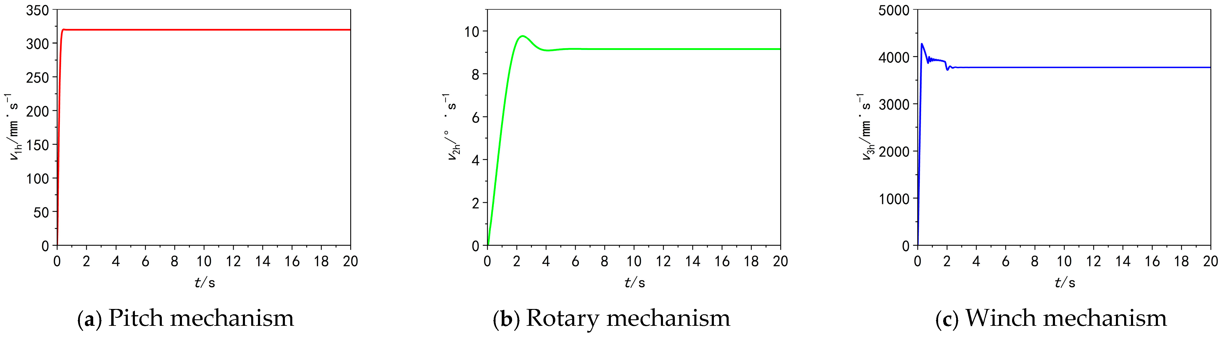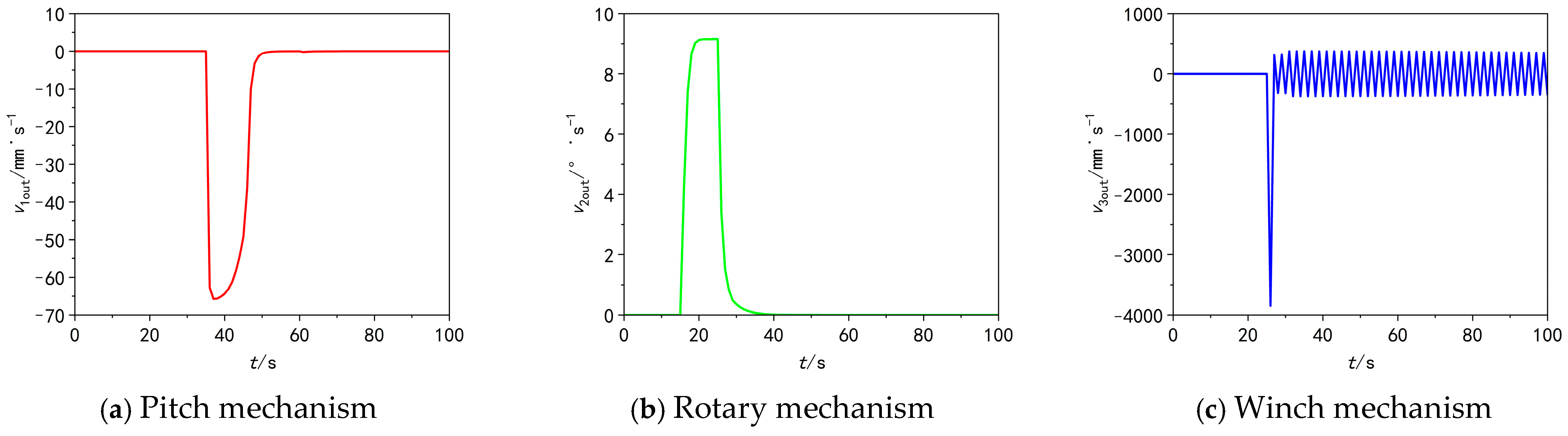 To simulate real working processes, position command timings and operation paths are precisely defined: pitch mechanism (35 s command, 0 m to −0.675 m in 10 s); rotary mechanism (15 s command, 0° to 91.2° in 10 s); winch mechanism (25 s command, 0 m to −5 m in 1.33 s).The simulation step size is set to 0.001 s, and the input position signals are shown in