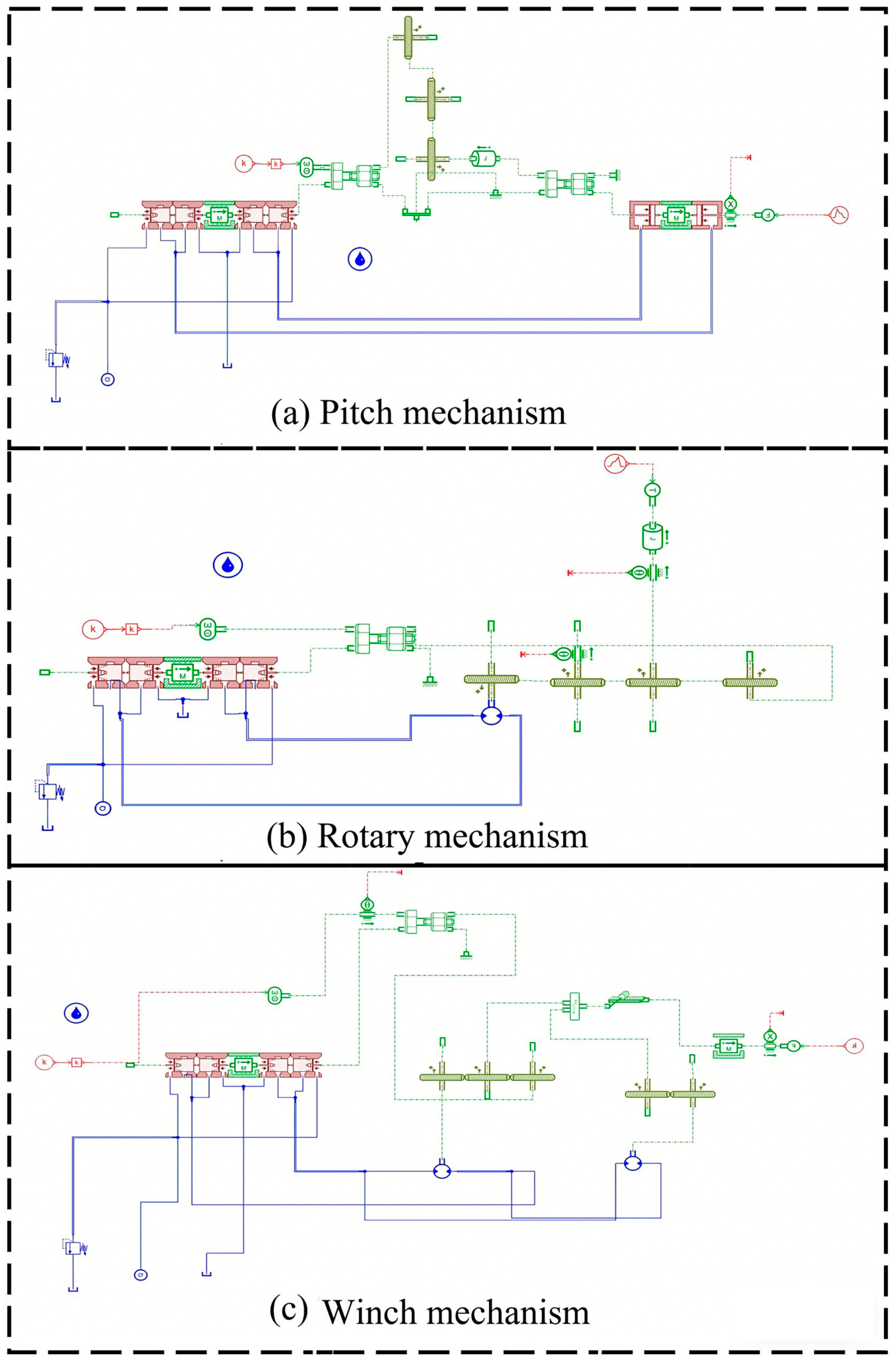 Figure 6 illustrates the AMESim component models for the pitch, rotary, and winch mechanisms, and