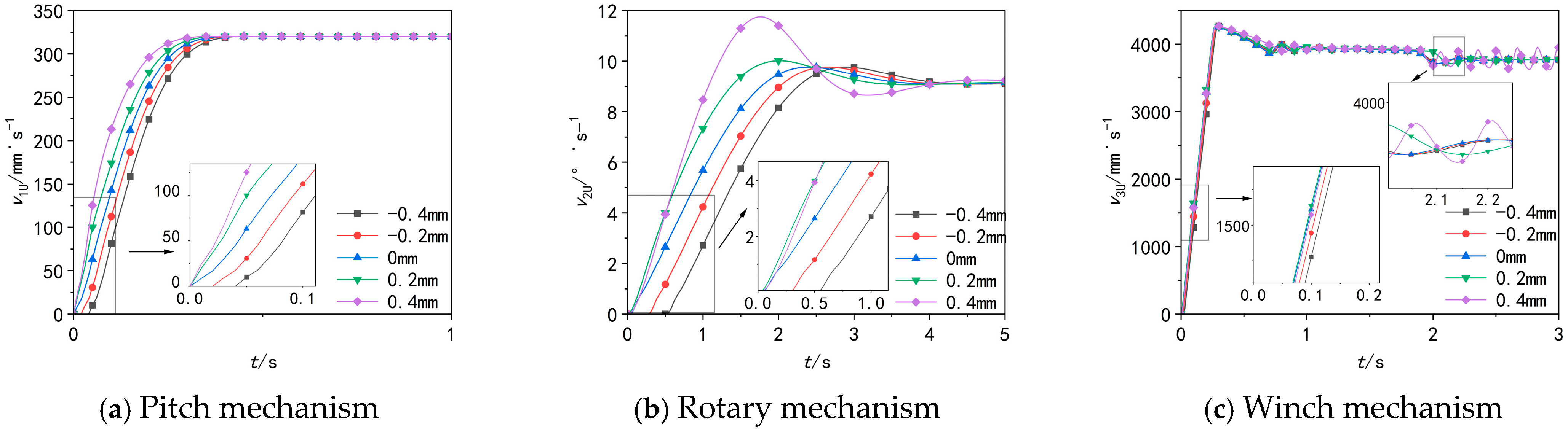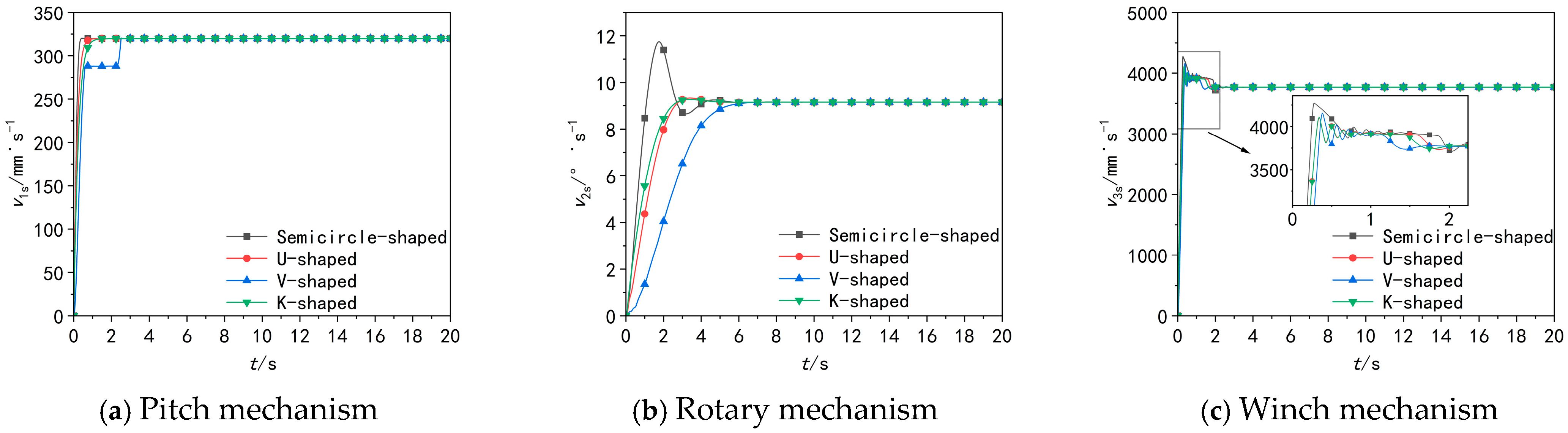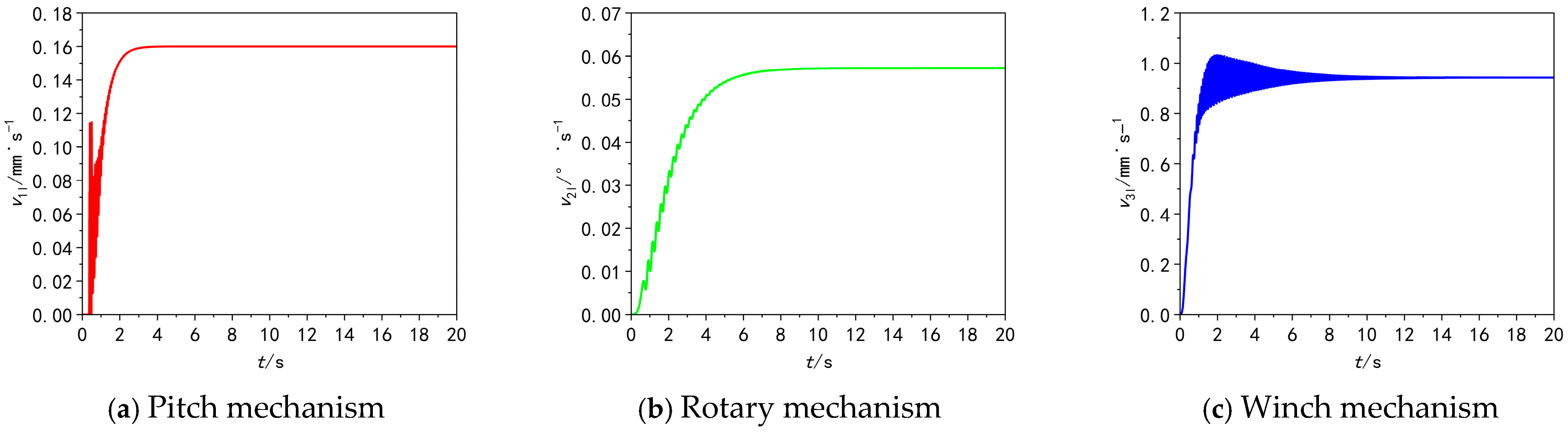 v3l represent the speed characteristics of the 3-DOF actuator when the stepper motor speed is 0.06 r/min. At the stable stage, the piston displacement speed of the digital hydraulic cylinder is approximately 0.159 mm/s, the rotational speed of the rotary mechanism is about 0.057°/s, and the speed of the winch mechanism is roughly 0.94 mm/s. These results are basically consistent with the Simulink simulation results presented in