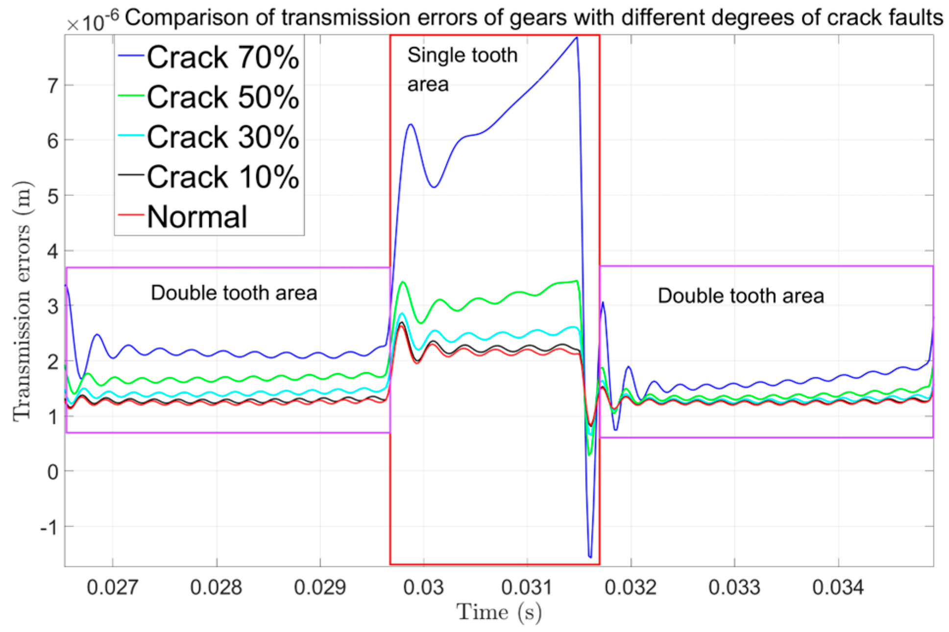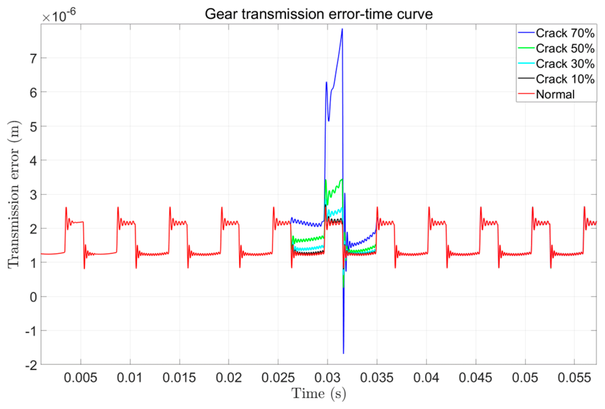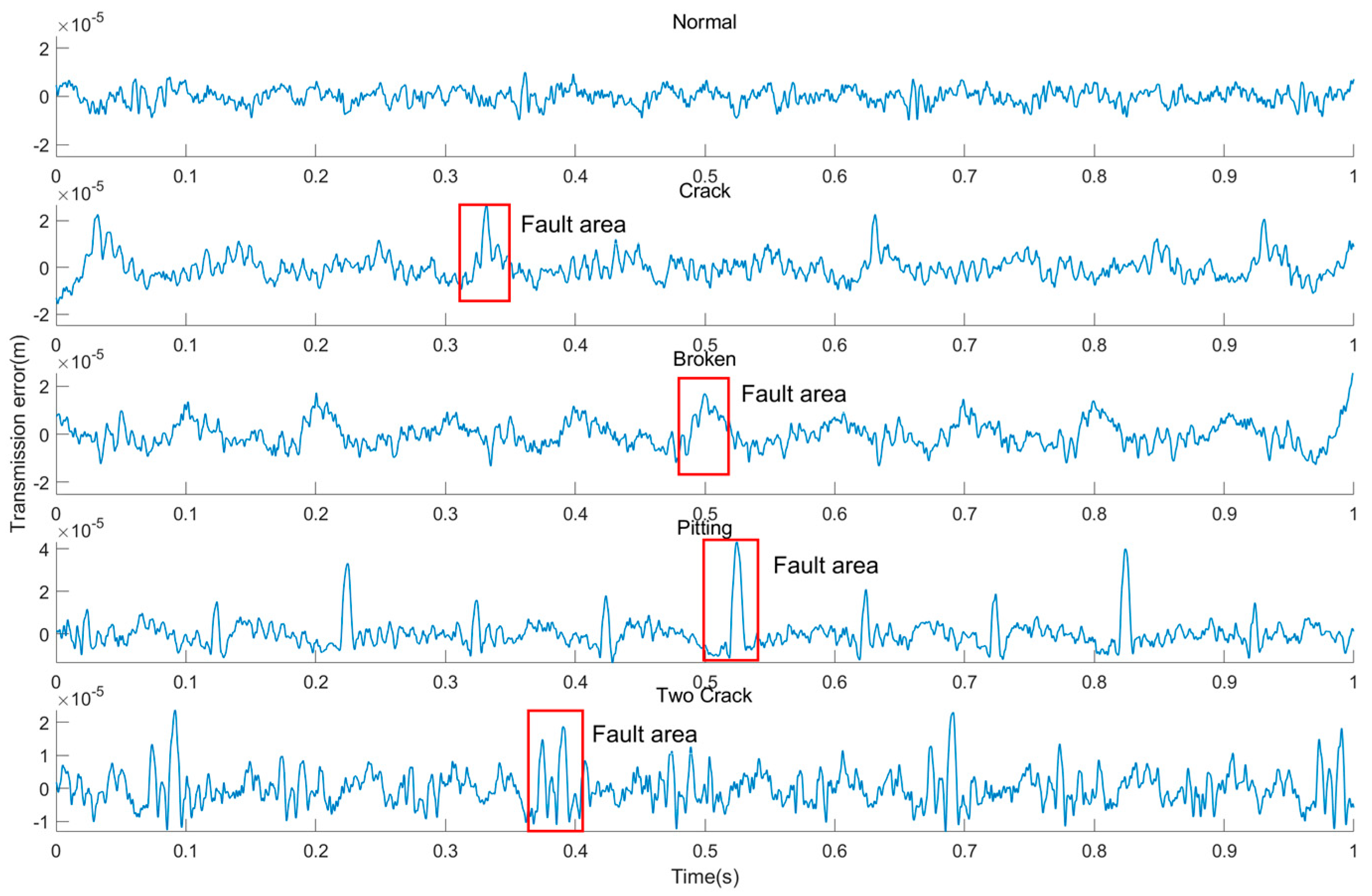 Figure 26. It now clearly exhibit that the transmission error signals of different faults after filtering clearly show the fault characteristics unique to other faults. For example, if there is a crack in the gear, it can be seen that the transmission error signal has prominent periodic peaks; when there is a double crack in the gear, periodic double peaks appear, which is consistent with the results obtained by the theoretical model.