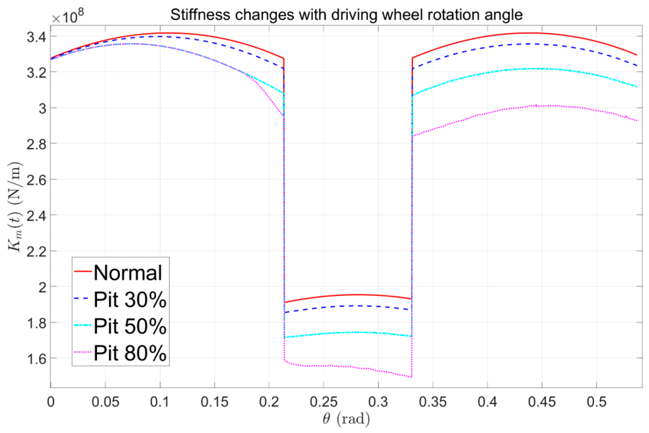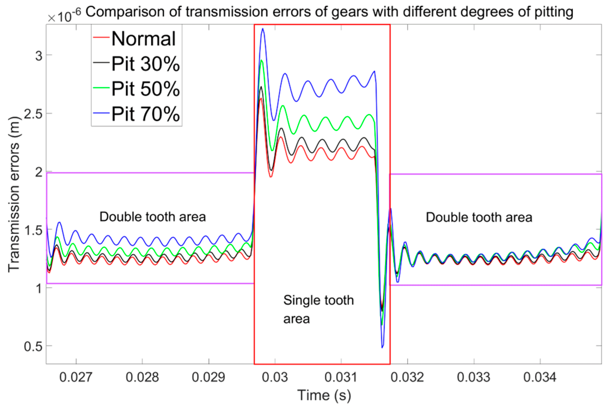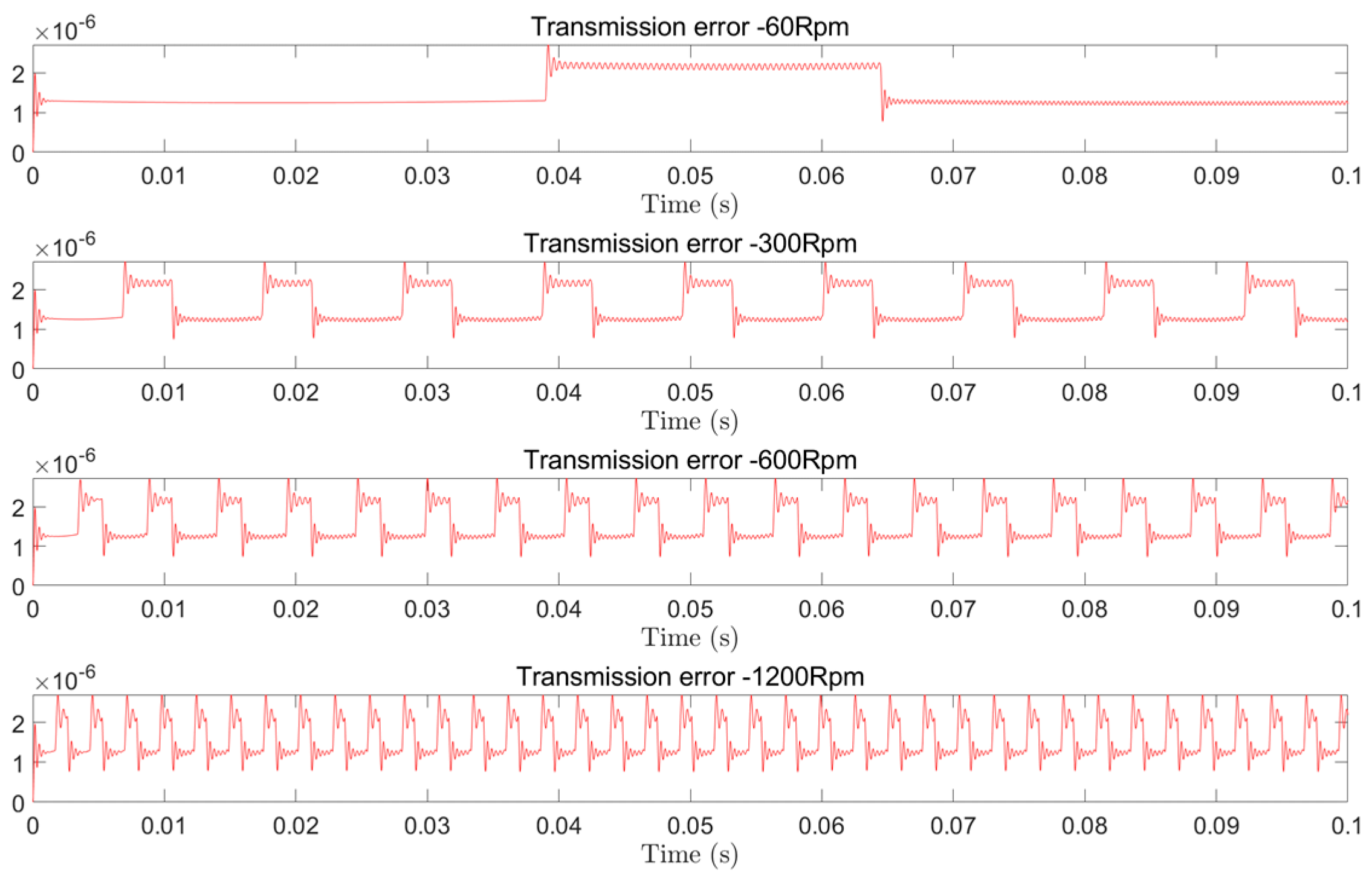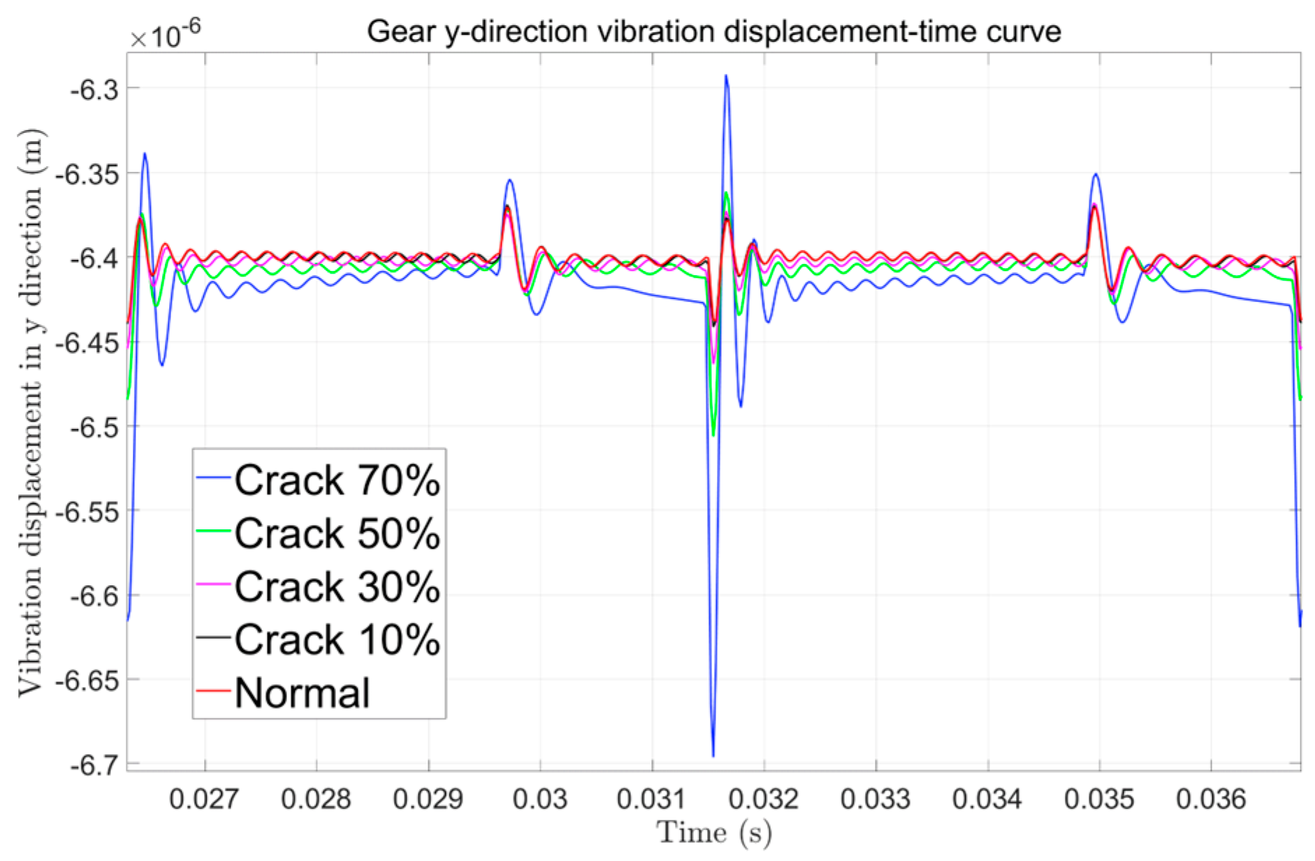 Figure 26. It now clearly exhibit that the transmission error signals of different faults after filtering clearly show the fault characteristics unique to other faults. For example, if there is a crack in the gear, it can be seen that the transmission error signal has prominent periodic peaks; when there is a double crack in the gear, periodic double peaks appear, which is consistent with the results obtained by the theoretical model.