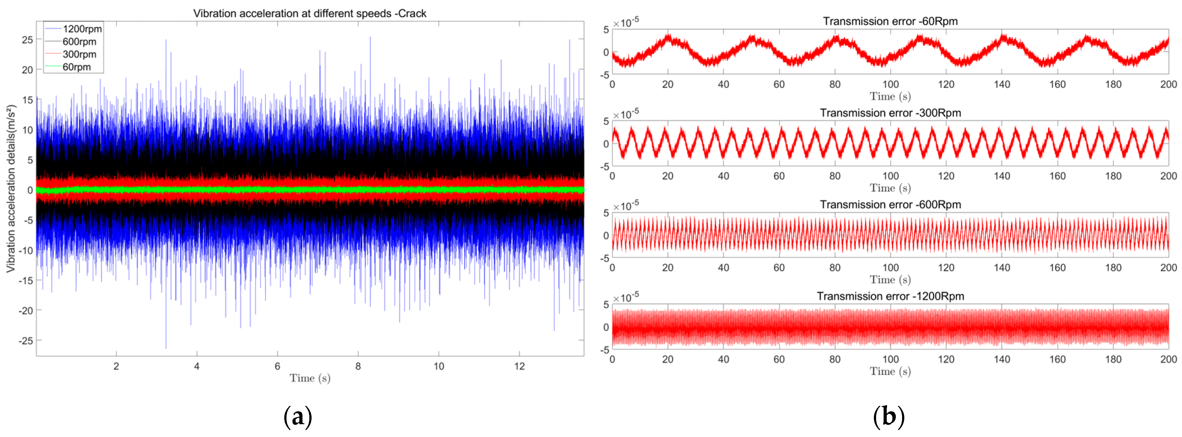 Subsequently, to assess rotational speed effects, we performed comparative testing on a cracked gear at four discrete speeds (60, 300, 600, and 1200 RPM), simultaneously recording vibration acceleration and transmission error signals. The acquired datasets are presented in