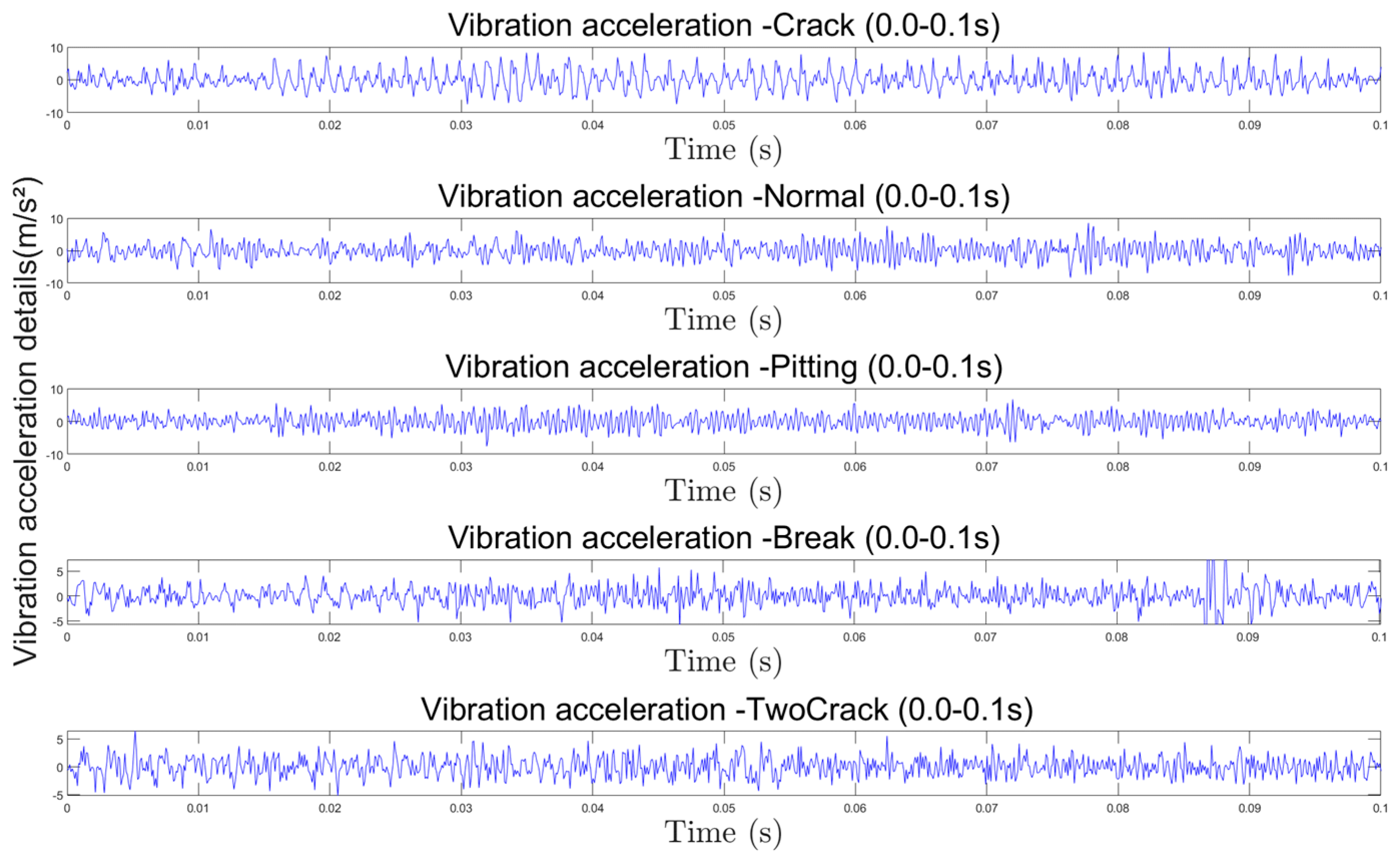 The platform mainly consists of: a 45w G-132A servo motor, two gearboxes (The accompanying gearbox is always equipped with normal gears manufactured by Huafei from Beijing, China), a magnetic powder brake, two PN72-E6S10000 incremental photoelectric encoders(Manufactured by Hengxiang from Qingdao, China), and three acceleration sensors(from Washington, DC, USA). The module of the steel spur gear is 1 mm, the number of teeth is 50 and 150, respectively, the pitch radius is 25 mm and 75 mm, respectively, the tooth width is 16 mm and 20 mm, and the pressure angle is 20°. Among them, the smaller gear is the input gear. Cracks, pitting, broken teeth, double cracks and other faults are all processed on the input gear. The crack length is 0.2 mm and the crack angle is 0°. The second crack of the double crack is separated from the previous crack by one tooth. Broken tooth: one tooth is removed from the gear. The pitting lengths are 4 mm, 2 mm, and 4 mm, the width is 2 mm, and the depth is 1 mm. The three pitting areas are concentrated close to the top of the tooth. The physical resolution of the two encoders is 10,000 ppr, which are installed on the input and output shafts of the gearbox, respectively. The sampling frequency of the encoder acquisition card is set to 10,000 Hz, and the quadruple frequency counting is realized through the AB two-phase pulse to improve the position accuracy. Considering the cost, the experiment uses a vibration acceleration signal sensor to measure the vibration acceleration signal. The acceleration sensor model is PCB-352C33, the sensitivity is 10.25 mV/m/s2, and the sampling frequency is 10,240 HZ.