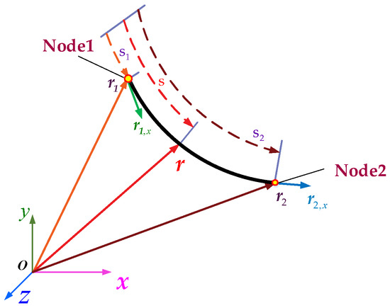 here, denotes vector of ALE-ANCF cable element, and represents time. The global position vectors , and gradient vectors , of two nodes are taken as nodal coordinates. , represent the material coordinates associated with each node. In a three-dimensional space, each node contributes three translational degrees of freedom from its position vector and three rotational degrees of freedom from its gradient vector, along with the material coordinate, resulting in a total of 14 degrees of freedom per element.