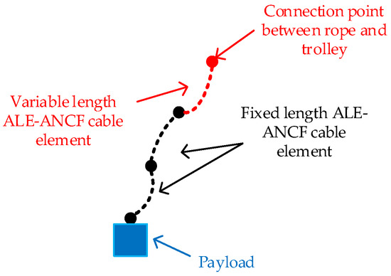 The hoisting rope in the lifting system can be subdivided into multiple ALE-ANCF cable elements. To improve the computational efficiency of the system’s dynamic equations, as shown in Figure 2, the modeling of the hoisting rope is categorized into ALE-ANCF cable elements with fixed length and those with variable length.