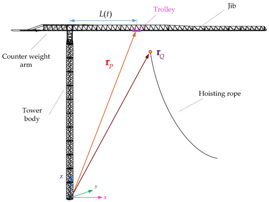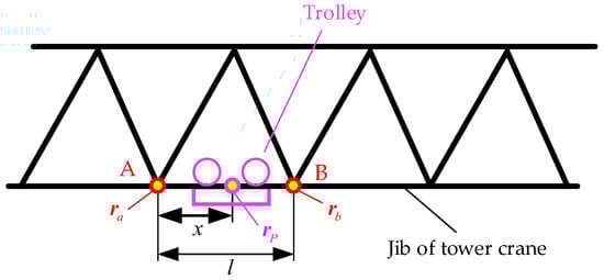 In this section, the beam element in the traditional Finite Element Method (FEM) is used to describe the structure of the tower crane. To describe the luffing motion of the tower crane, a non-generalized coordinate needs to be introduced to define the position of the trolley on the jib. Through kinematic constraints, the hoisting rope is connected to the tower crane. It is assumed that the position of the trolley is , and the position of the wire rope’s endpoint is . These two positions coincide in space. The schematic view of the constraints between the tower crane and hoisting rope is given in Figure 3. The constraint equations are: