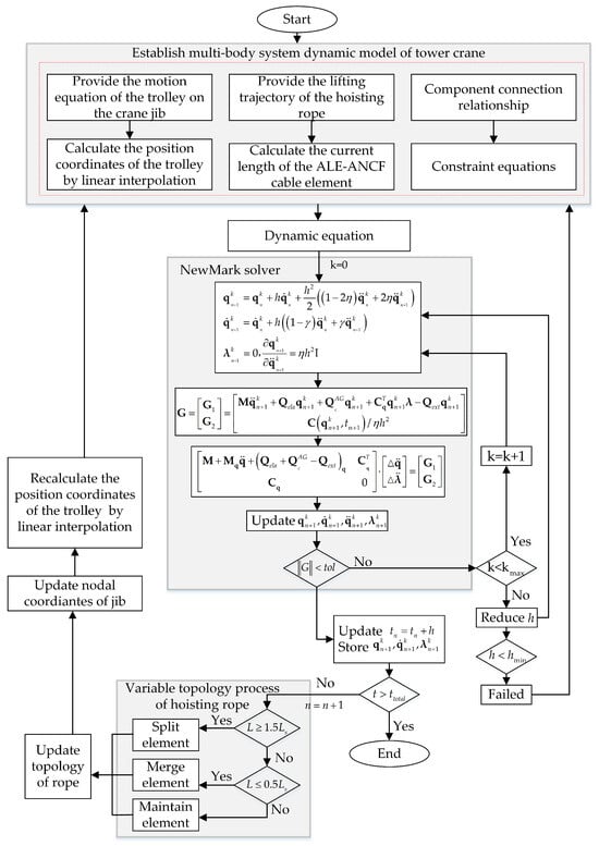 As illustrated in Figure 5, the multibody dynamic equations of the tower crane are solved using NewMark solver. In this model, the steel structure is modeled via the conventional finite element method, with its mass and stiffness matrices remaining constant. The hoisting rope section changes its length according to the transportation trajectory. Consequently, its corresponding mass matrix , elastic force vector , generalized additional inertial force vector , system constraint equations , Jacobian matrix of the system constraint equations with respect to the nodal coordinates , Lagrange multiplier vector , and generalized external force vector all require updating during the solution process. Since the trolley’s trajectory is calculated based on linear interpolation of the tower crane jib’s positional coordinates, when the crane is activated and responds, causing the jib’s positional coordinates to change, it becomes necessary to synchronously update these jib coordinates during the solution process to achieve control of the hoisting trajectory under the condition of structural deformation of the tower crane.