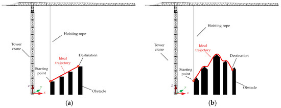 Tower crane system under different trajectories. (a) Tower crane system under straight trajectory. (b) Tower crane system under curve trajectory.