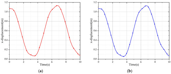 x displacement of the driver’s room under different trajectories. (a) x displacement of the driver’s room under straight trajectory. (b) x displacement of the driver’s room under curve trajectory.
