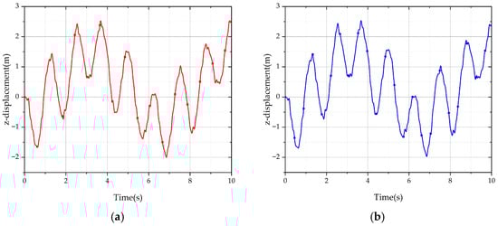 Figure 9 demonstrates the horizontal movement of the driver’s room during operation along two different hoisting trajectories. The vertical deformation of jib free tip during the hoisting operation is illustrated in Figure 10. The comparative results demonstrate that the proposed modeling method in this study effectively achieves various hoisting trajectories while accounting for the deformation of the tower crane jib. The “effectiveness” demonstrated here refers to the platform’s capability to produce physically plausible results for subsequent analysis, while a full validation of accuracy against physical data remains a subject for future case-specific studies.