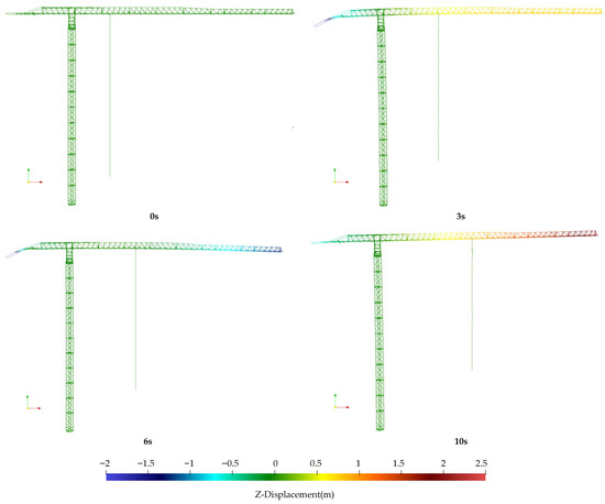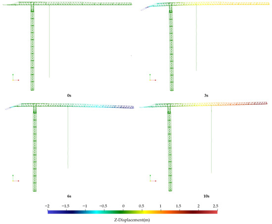 The motion sequence of the hoisting rope along different trajectories at various time points are illustrated in Figure 11 and Figure 12. The figure also shows the displacement deformation of the tower crane structure along the z-direction. The simulation platform developed by the author effectively demonstrates the real-time deformation of the jib induced by the payload’s amplitude variation during tower crane operation. Figure 13 presents overall and local views of the tower crane at its jib tip’s peak displacement, showing the von Mises stress distribution. The maximum stress is within the material’s allowable limit.