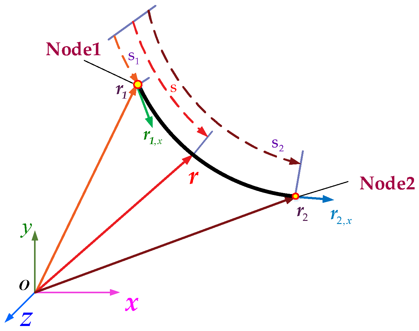 | , | the nodal coordinates at both ends of the beam element |