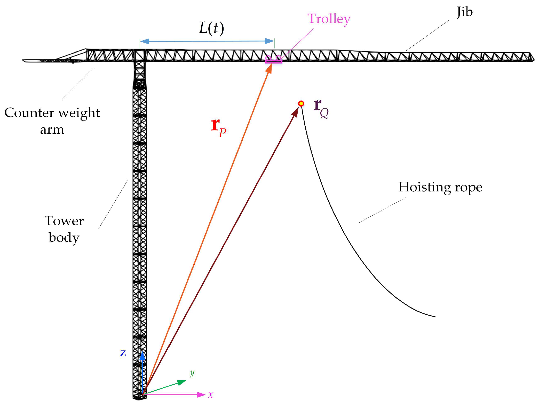 | , , | the nodal coordinate vector of element, tower crane, hoisting rope |
