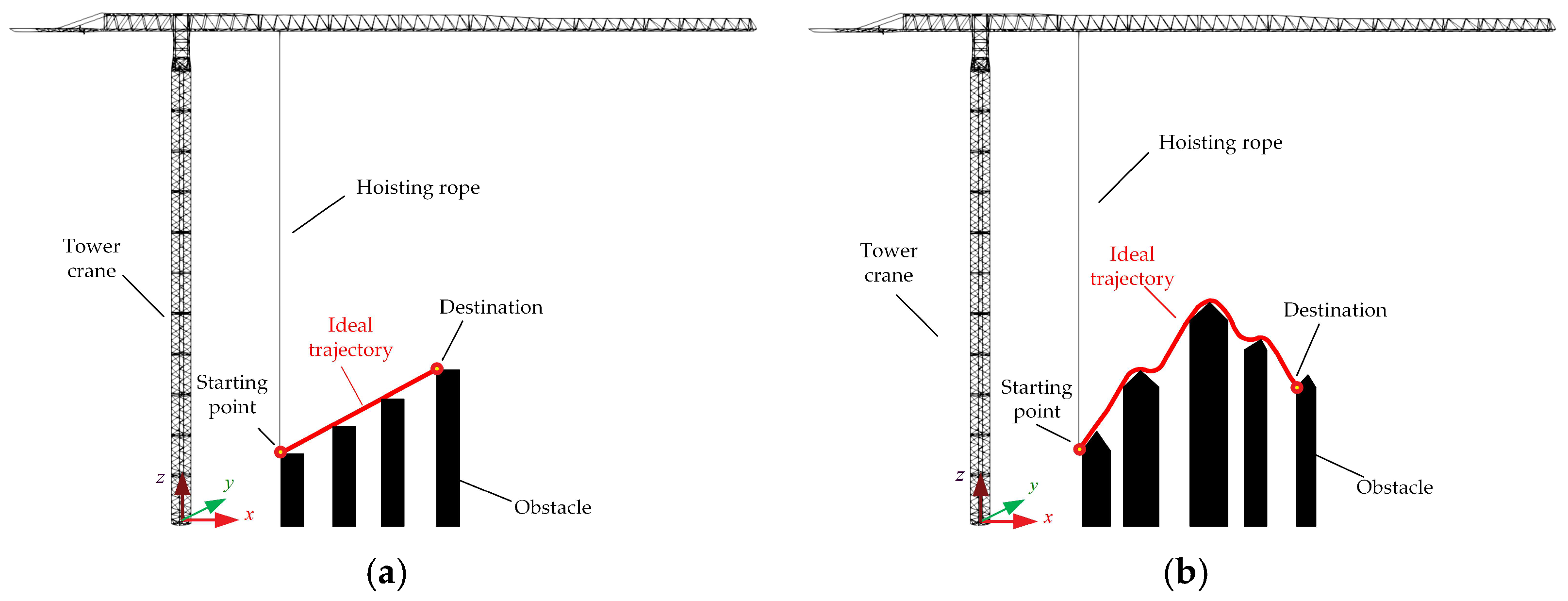 - Zhang, M.; Zhang, Y.; Ji, B.; Ma, C.; Cheng, X. Adaptive sway reduction for tower crane systems with varying cable lengths. Autom. Constr. 2020, 119, 103342. [Google Scholar] [CrossRef]