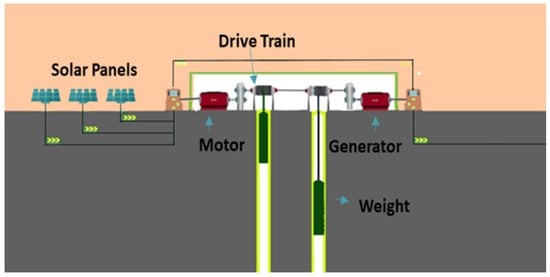 The conceptual model of the proposed gravity-based energy storage system is shown in Figure 3. The proposed system is hoisted underground, consisting of steel and a stack weight cable mechanism moving vertically to generate potential energy. The solar panel produces electrical energy, and it is given to the load during normal operation []. If excess energy is available, it is transferred to the motor in order to raise the stack weight from the bottom to the top surface. With the aid of a generator connected to the drive train system, the potential energy is transformed into electrical power when the stack weight is released due to gravity [,].