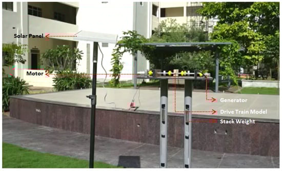 The experimental setup of the proposed gravity-based energy storage system is shown in Figure 6. Two steel stack weights, load 1 and load 2, are placed in a hollow cylindrical tube beneath the drive train system. The solar panel output is given to the motor to rotate the pulley through the gear arrangements, which pulls the load stack upward []. When the stack weight moves down due to gravity, the LED load connected to the generator will glow [,]. See Supplementary Materials.