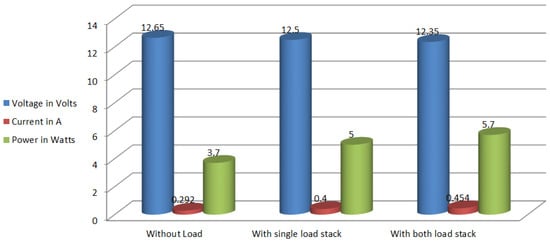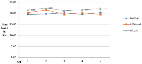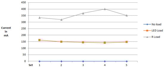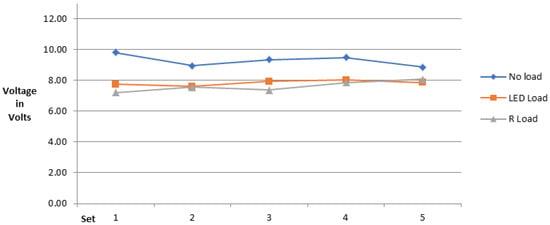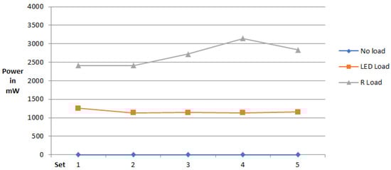 Figure 13 represents the corresponding power output variation across different sets, demonstrating that the resistive load condition produces the maximum power, followed by the LED load and no-load conditions.