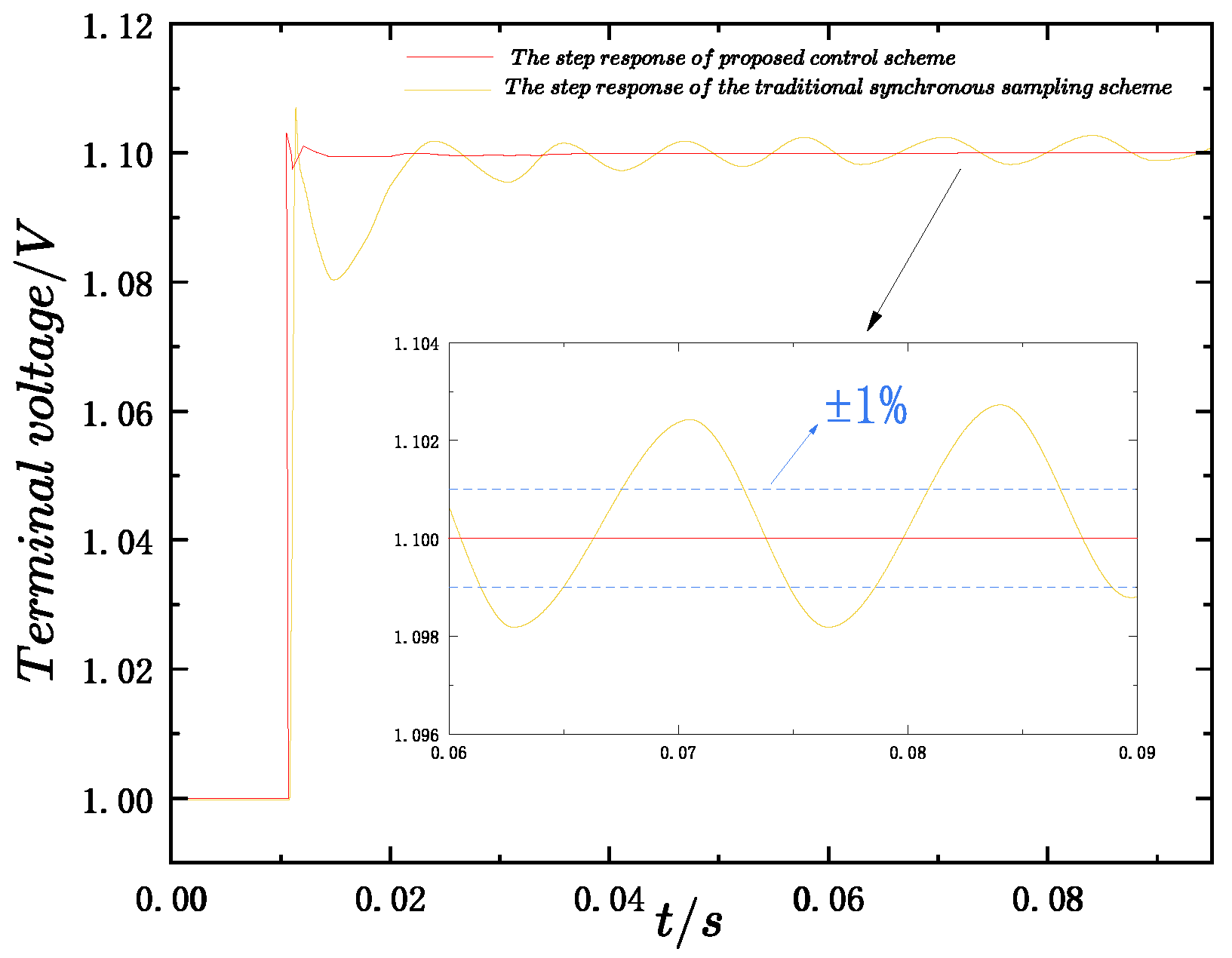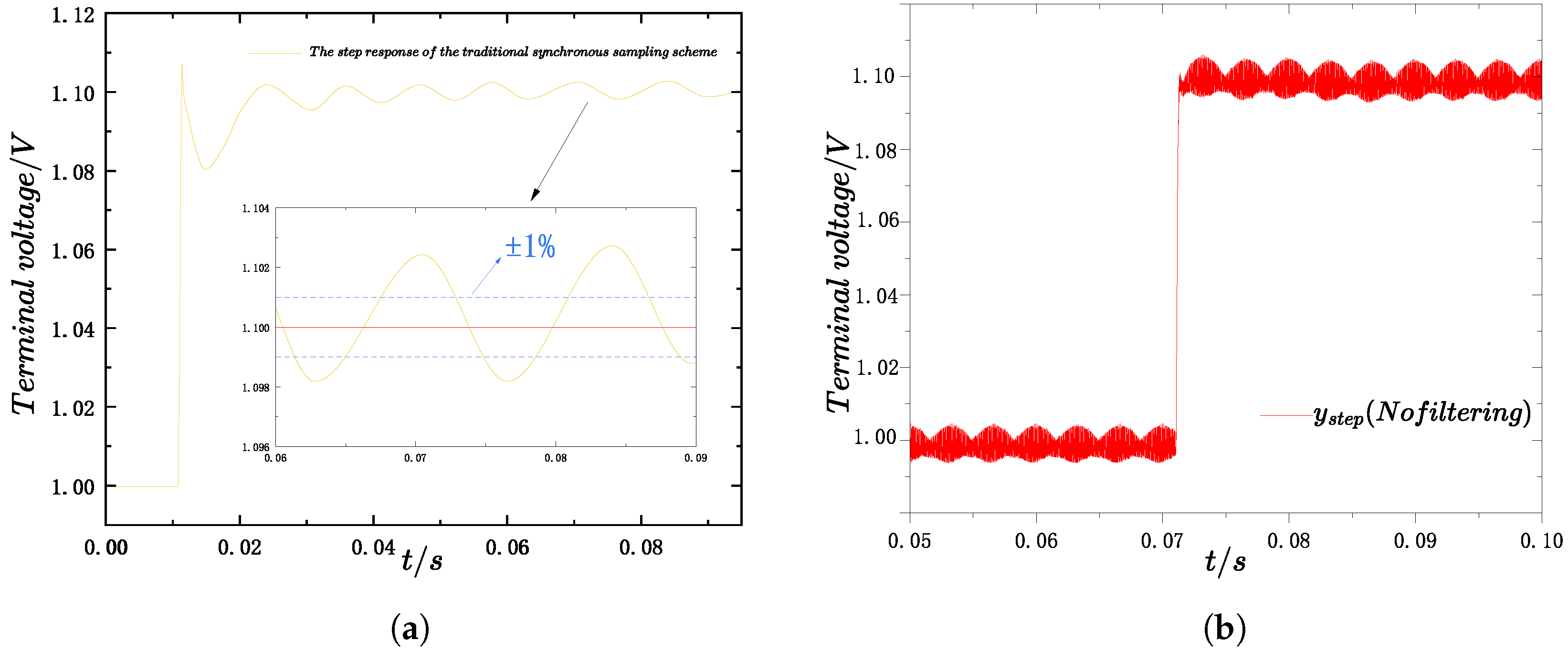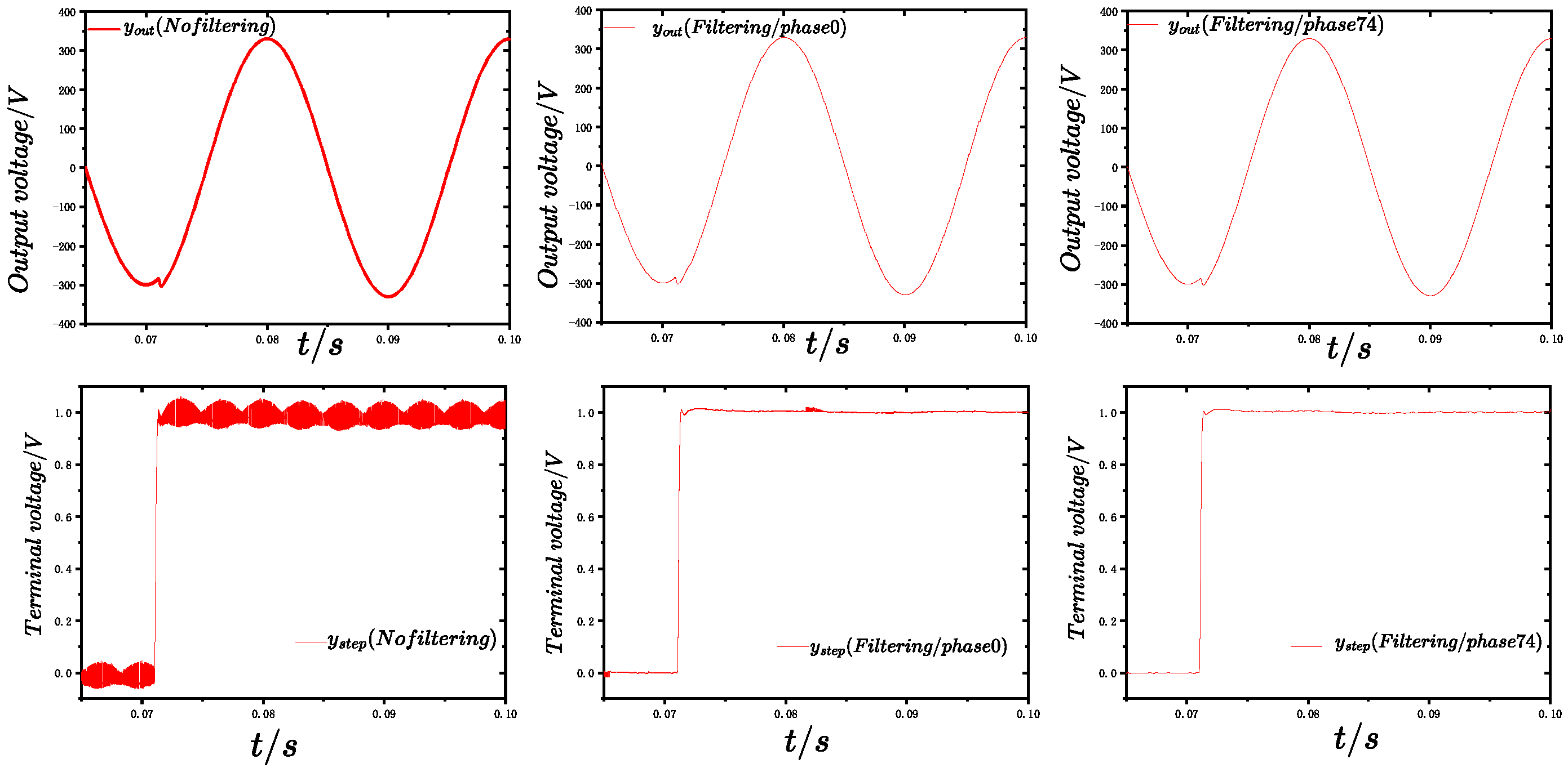 45]. To avoid aliasing distortion in digital filtering, oversampling is required before filtering. In this study, an 8× oversampling rate is adopted to ensure alias-free signal acquisition. Additionally, selecting a sampling phase with reduced harmonic components further enhances the filtering performance. For analog filtering, downsampling must be performed after filtering to ensure complete suppression of ripple. Similarly, an appropriate sampling phase with low harmonic content is selected to optimize the filtering effect. Through these measures, both digital and analog filtering approaches are capable of generating a ripple-free and distortion-free step reference waveform, which serves as a reliable foundation for subsequent controller parameter optimization.
