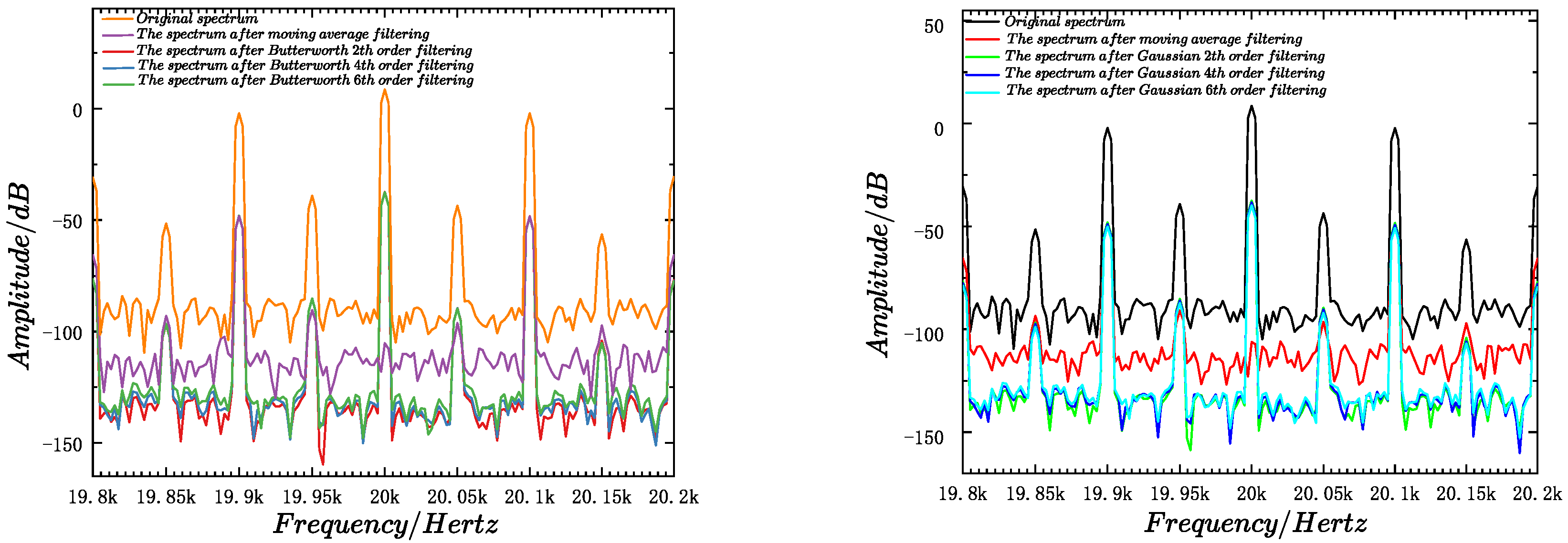 dB. Based on this sideband suppression profile, Butterworth and Gaussian analog filters were designed accordingly. The sideband attenuation performance near 20 kHz for the moving average filter and the designed analog filters is shown in