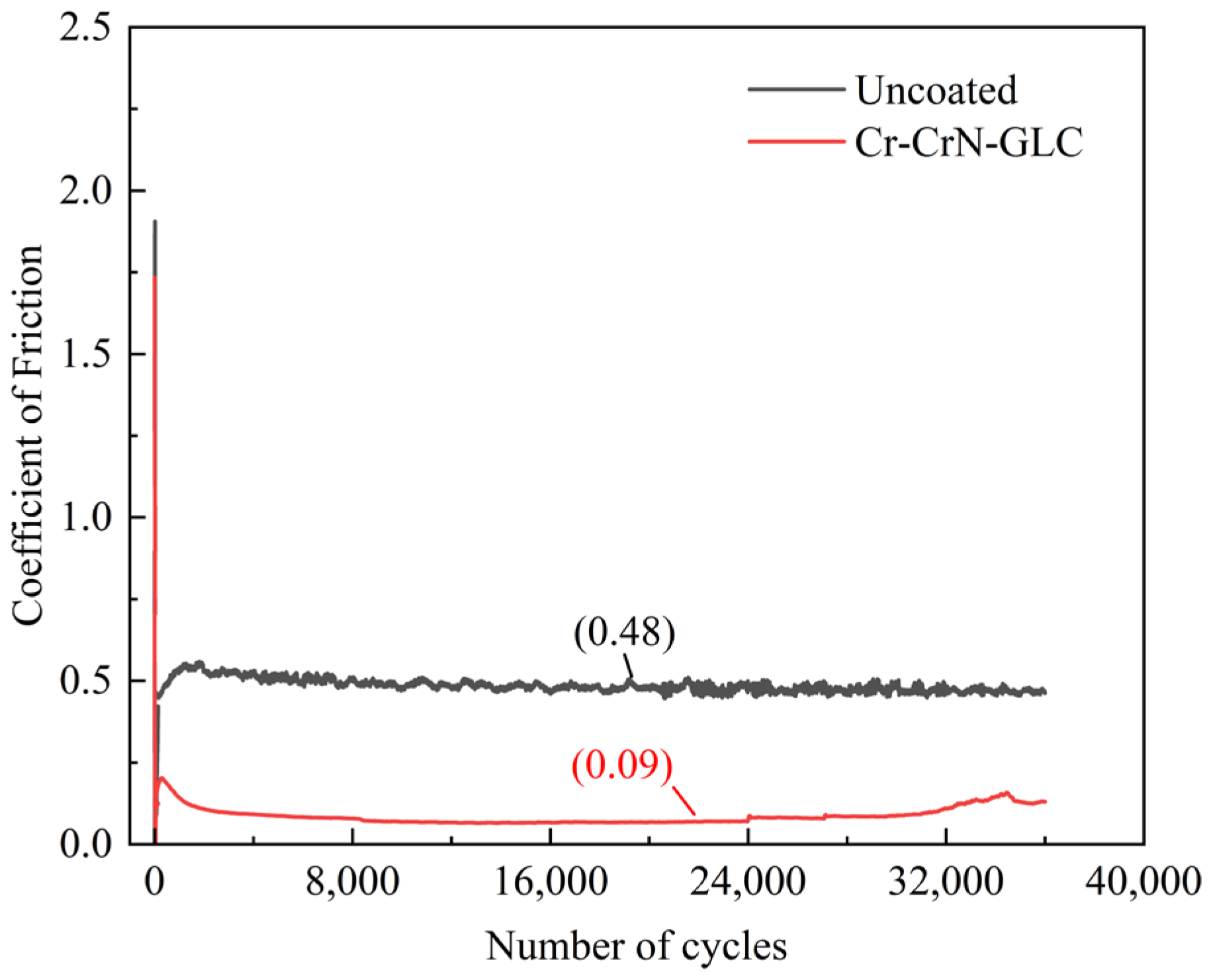 While determining the wear coefficients through experiments in the previous section, the friction coefficients of the specimens under uncoated and GLC-coated were also obtained. Figure 4 shows the friction coefficient curves of the two groups of specimens. In the initial stage, the friction coefficient fluctuates significantly due to the presence of micro-protrusions on the surface. As the number of cycles increases, the micro-protrusions are gradually worn flat, and the friction tends to stabilize. In the stable stage, the friction coefficient of the uncoated specimen is 0.48, while that of the coated specimen is 0.09.