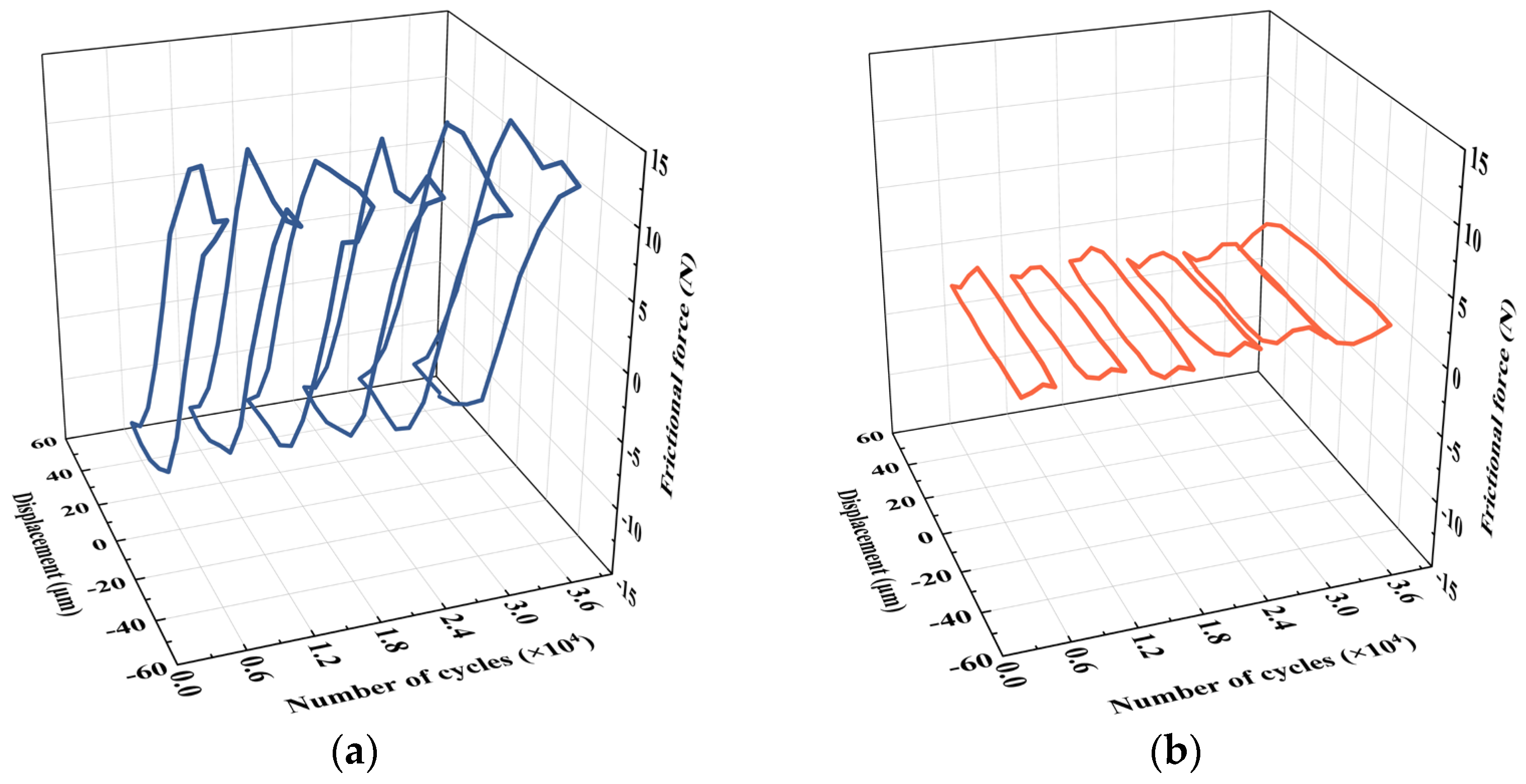 Figure 5. Curves of friction force-displacement-cycle number for the two groups of specimens. (a) Uncoated; (b) Coated.