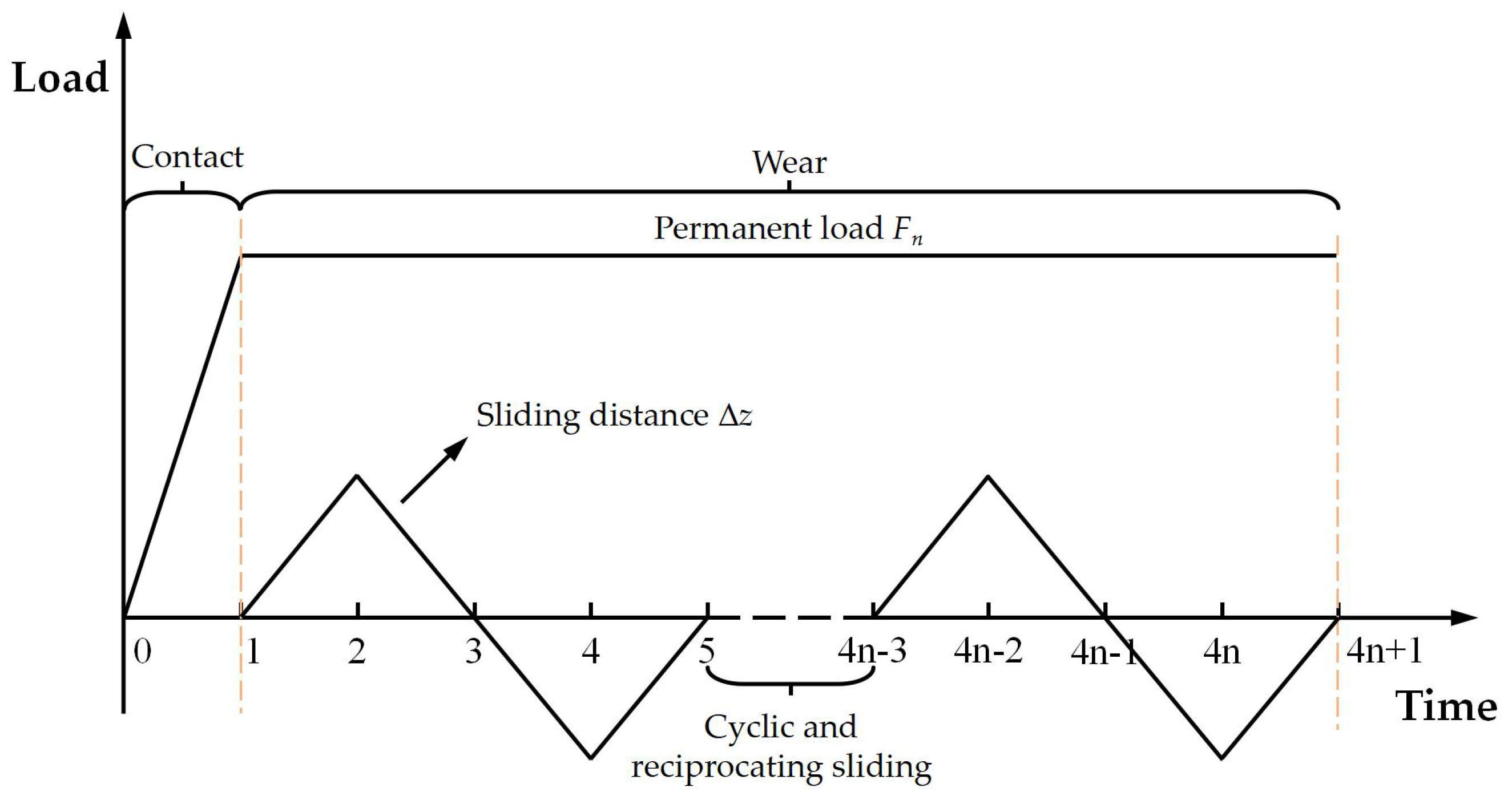 To ensure numerical convergence, the simulation was conducted in two sequential stages: a normal loading phase lasting 1 s, followed by a fretting wear phase lasting 5 s. The loading history, including both applied load and reciprocating displacement, is depicted in Figure 7.