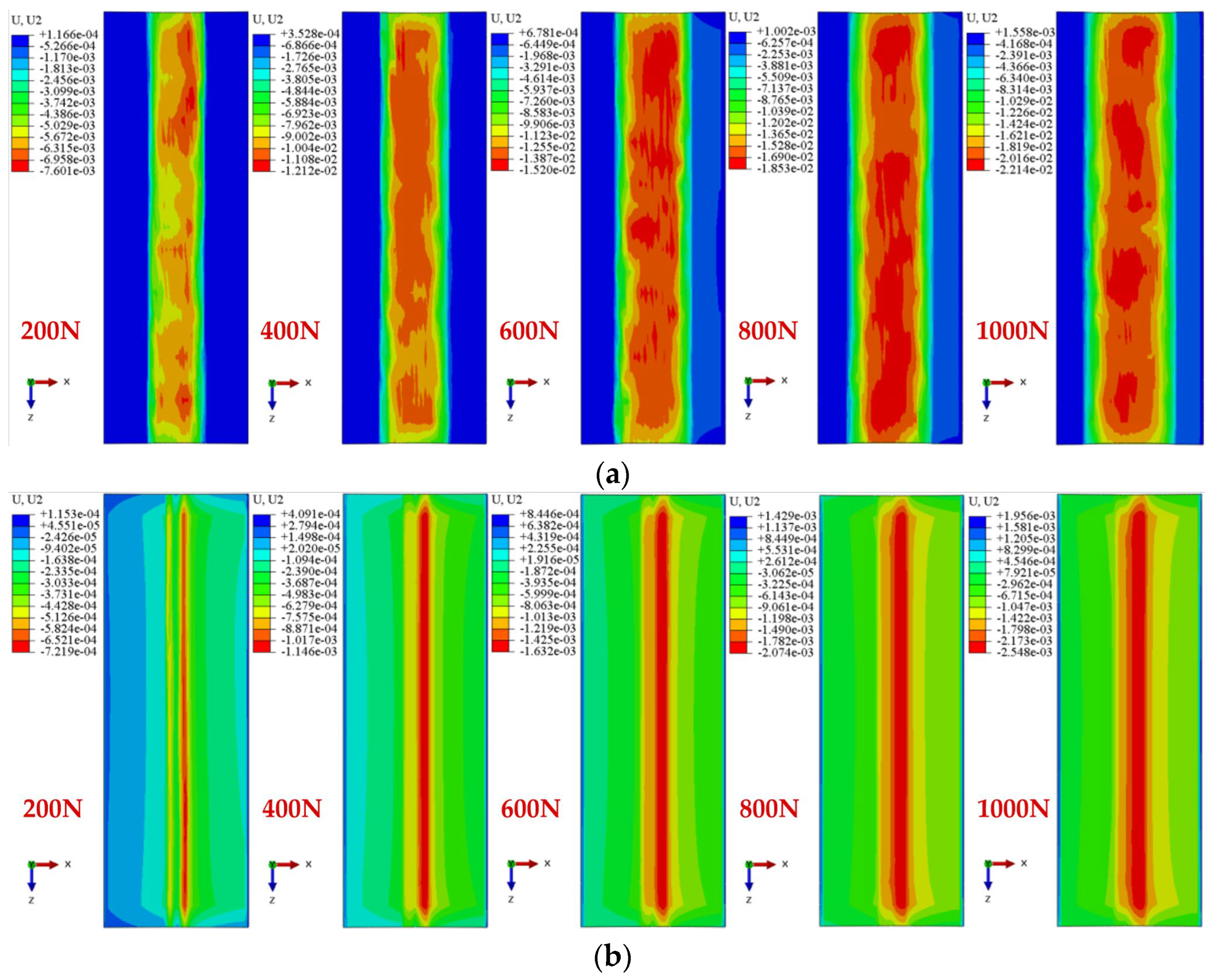 Figure 8. Simulation contour maps of raceway fretting wear scars under different normal loads. (a) Uncoated; (b) Coated.