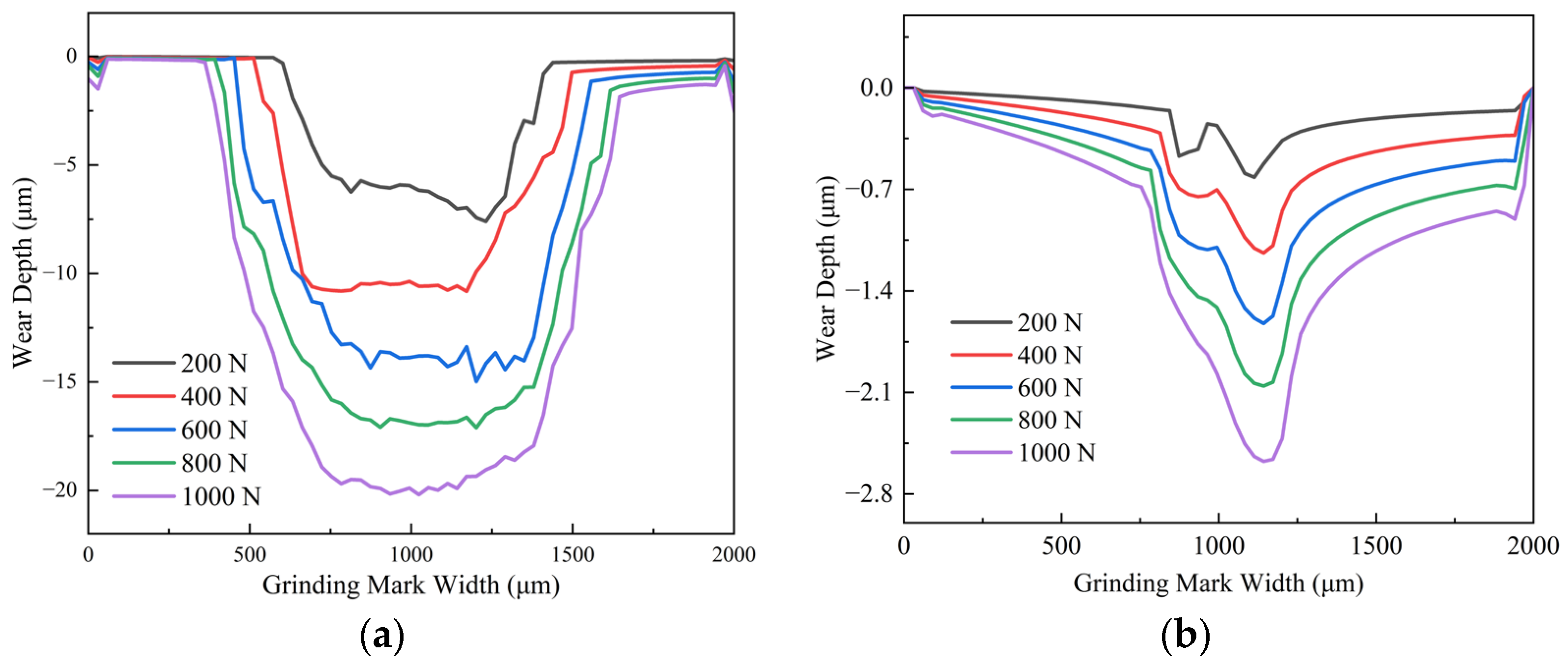 Figure 9. Comparison of cross-sectional wear scar profiles for uncoated and GLC-coated raceways at different normal loads. (a) Uncoated; (b) Coated.