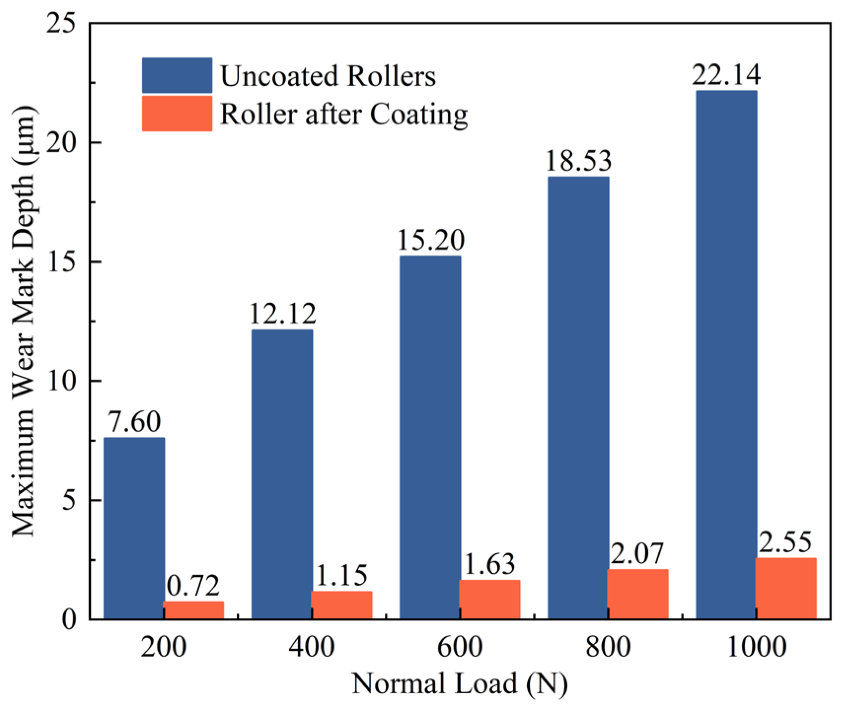 Figure 10. Maximum wear scar depth of raceway under uncoated and GLC-coated conditions at different normal loads.