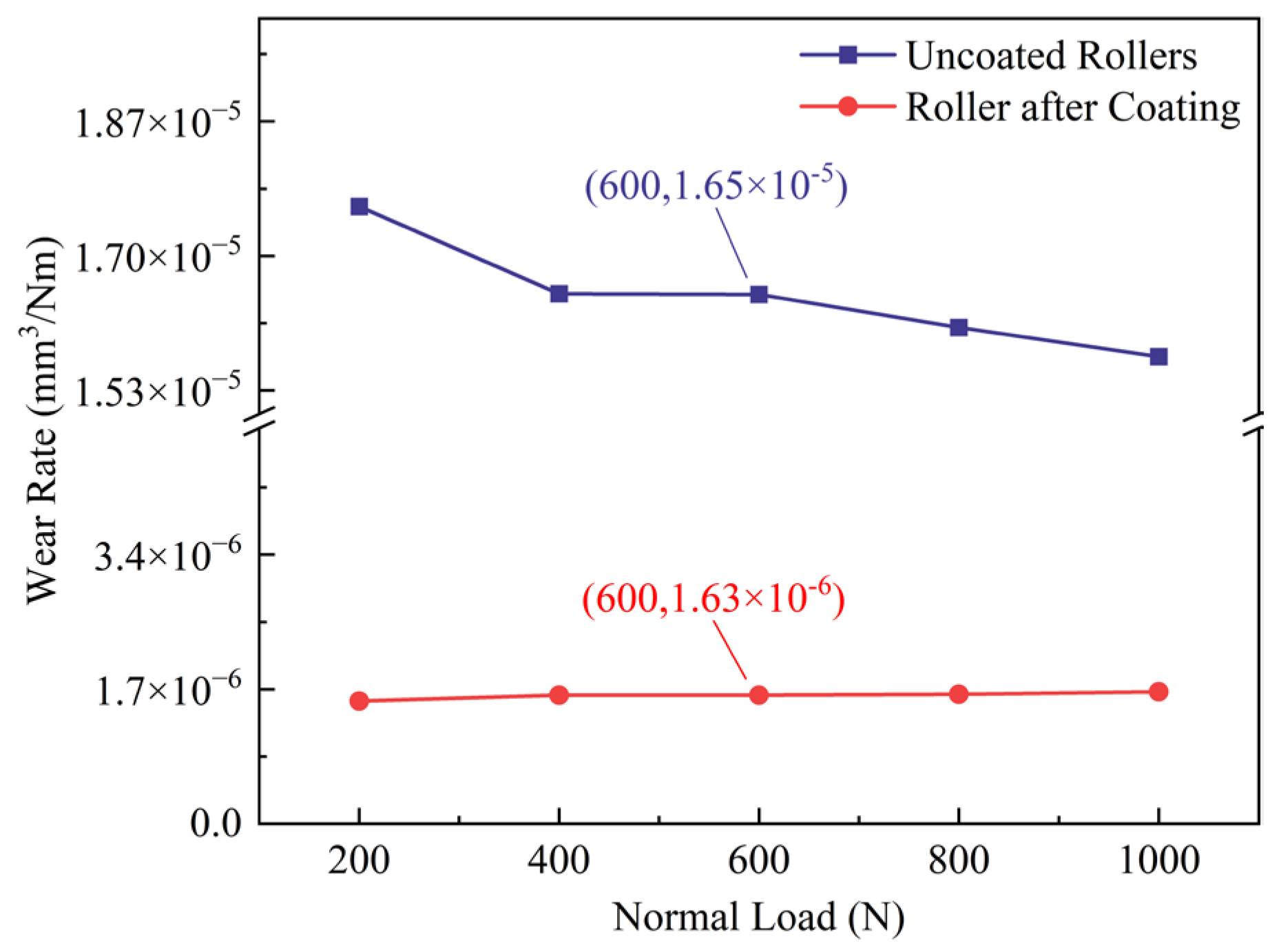Figure 11. Comparison of raceway wear rates under uncoated and GLC-coated conditions at different normal loads.