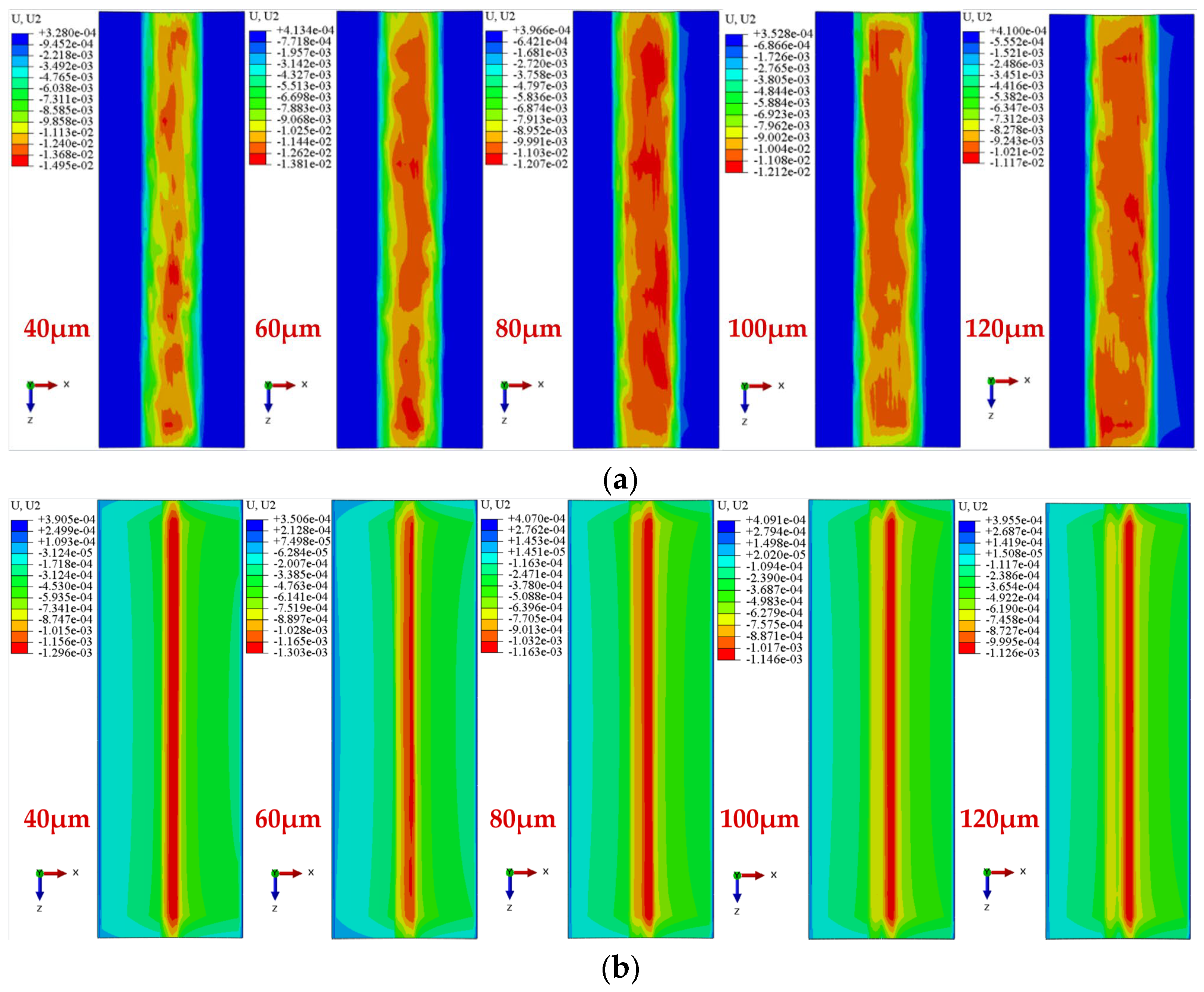 Figure 12. Simulation contour maps of raceway fretting wear scars under uncoated and GLC-coated conditions at different displacement amplitudes. (a) Uncoated; (b) Coated.