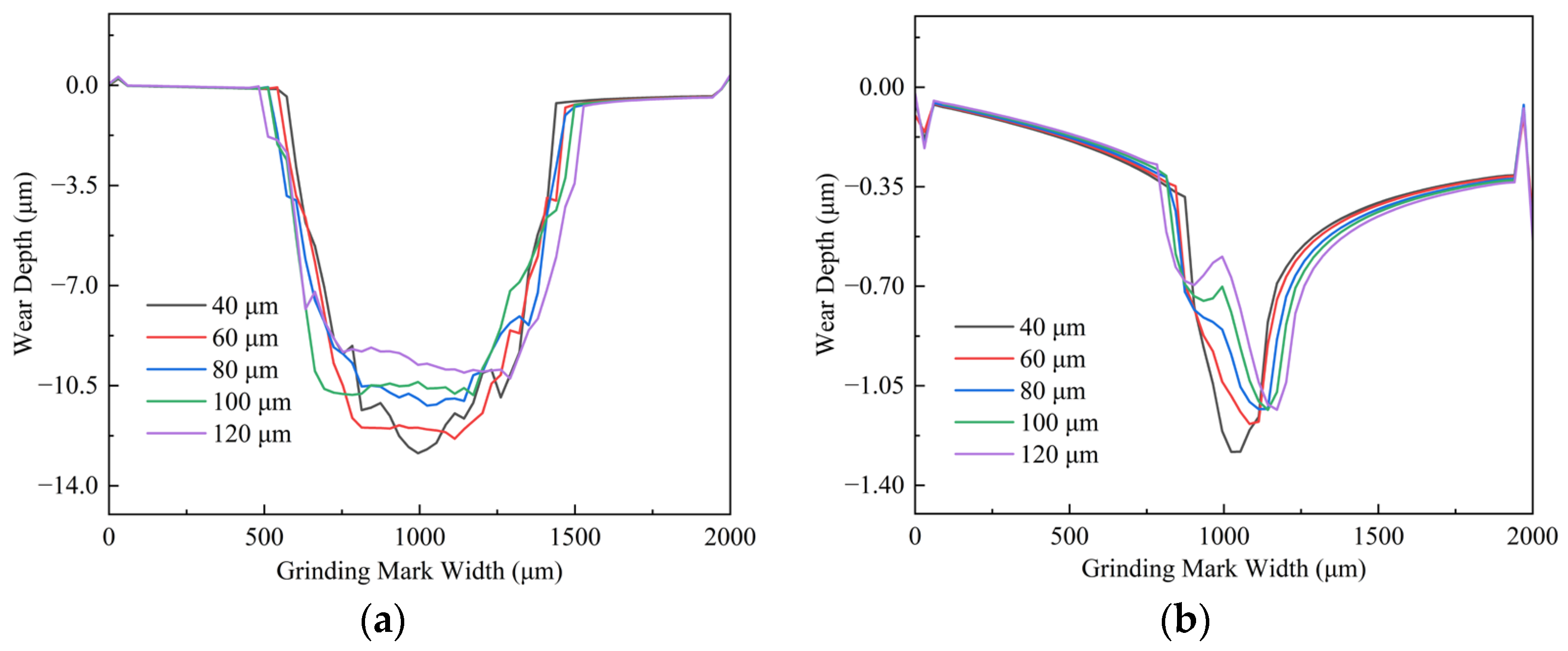 Figure 13. Comparison of cross-sectional profiles of raceway wear scars under uncoated and GLC-coated conditions at different displacement amplitudes. (a) Uncoated; (b) Coated.