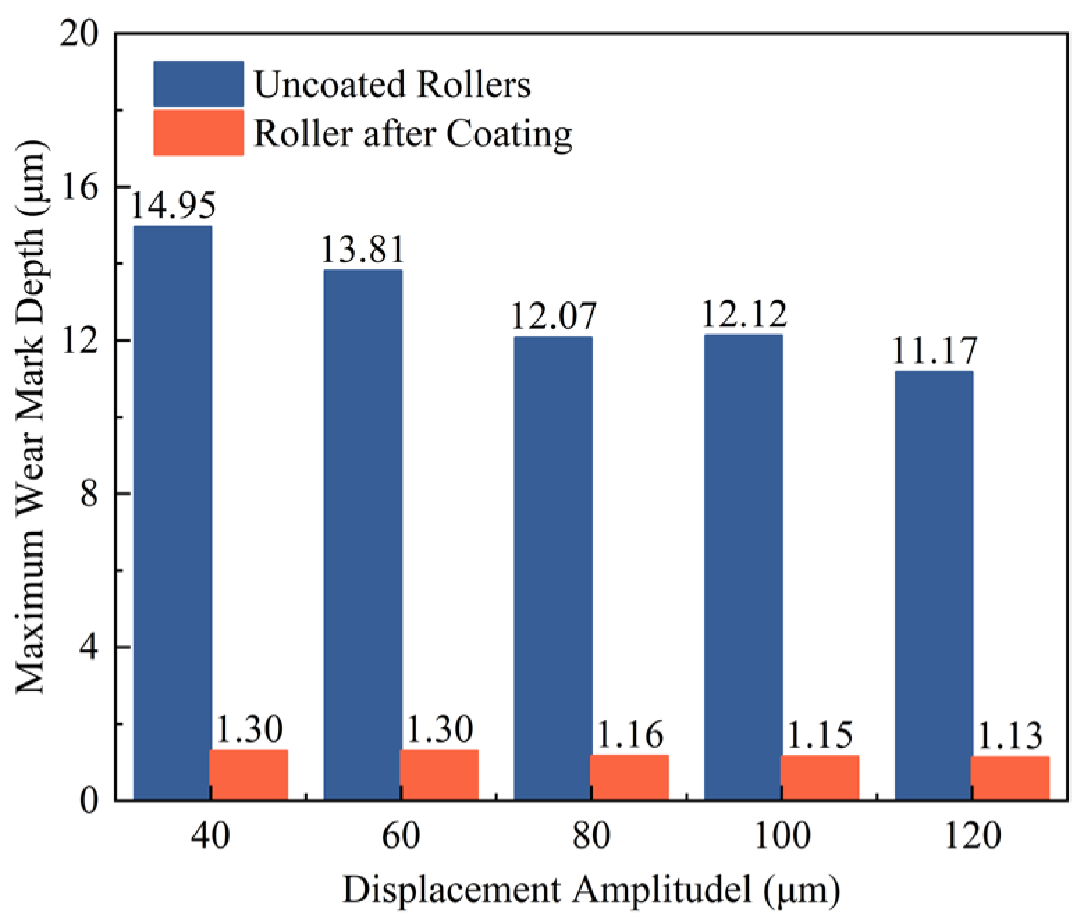 Figure 15. Comparison of raceway wear rates under uncoated and GLC-coated conditions at different displacement amplitudes.