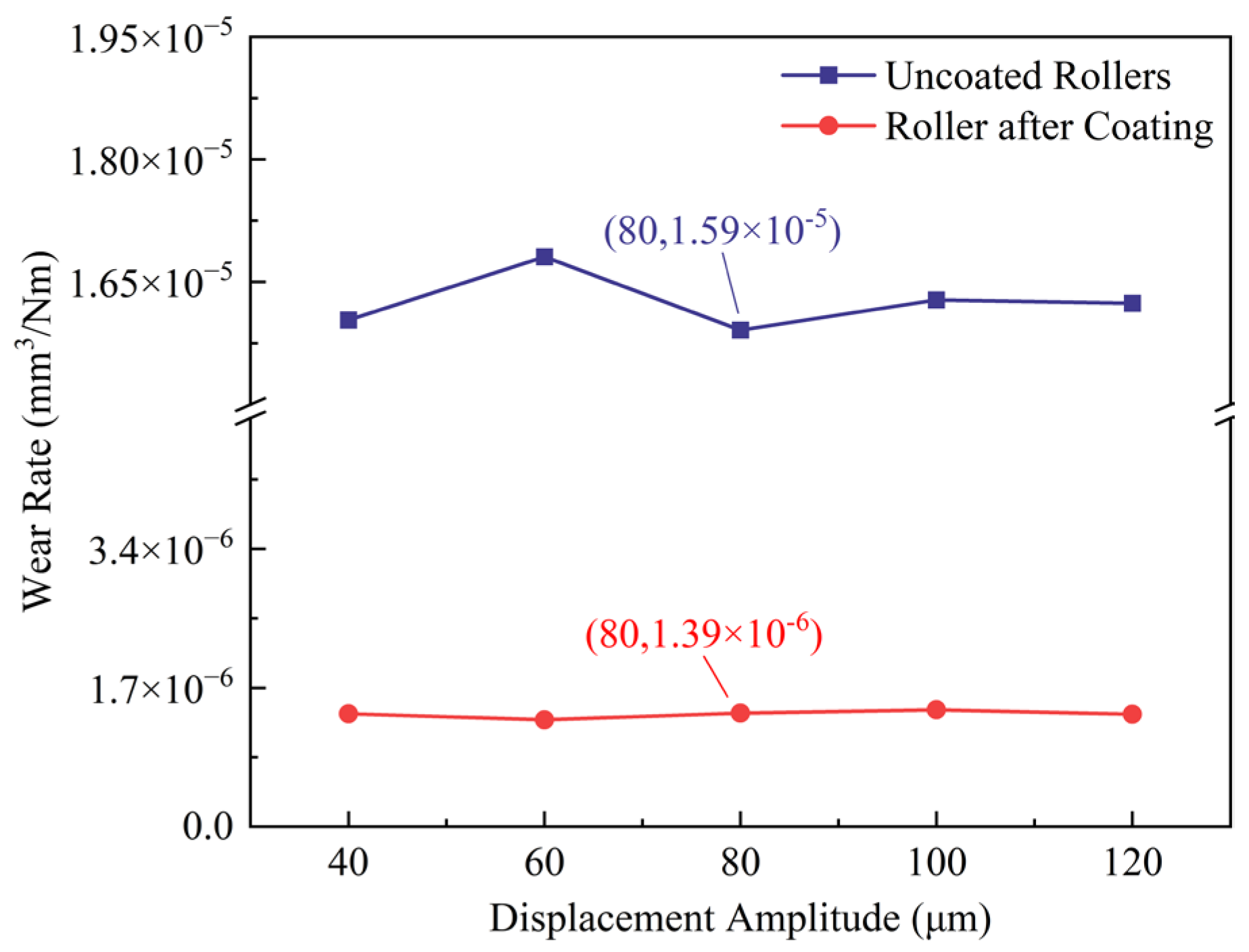 Figure 15 shows that under different displacement amplitude conditions, the wear rates of both the uncoated and coated roller–inner ring pairs exhibit a relatively stable trend. However, compared to the wear rate of the uncoated pair, the range of variation in the wear rate of the coated pair is significantly smaller, with notably improved stability. This improvement is primarily attributed to the superior properties of the GLC film, such as a low friction coefficient, high hardness, and high chemical inertness. Specifically, the low friction coefficient effectively reduces shear stress between the friction pairs, thereby alleviating adhesive wear and surface plastic deformation. The high hardness significantly enhances the material’s resistance to scratching and plastic deformation, while the high chemical inertness prevents the film from reacting with media in complex frictional environments, thus avoiding the exacerbation of corrosive and oxidative wear.