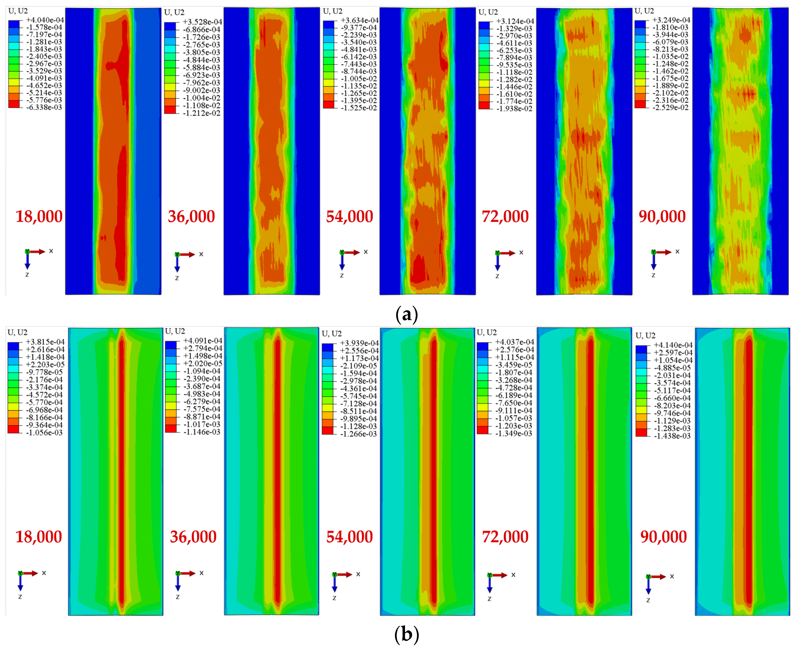 Figure 16. Simulation contour maps of raceway fretting wear scars under uncoated and GLC-coated conditions at different cycle numbers. (a) Uncoated; (b) Coated.