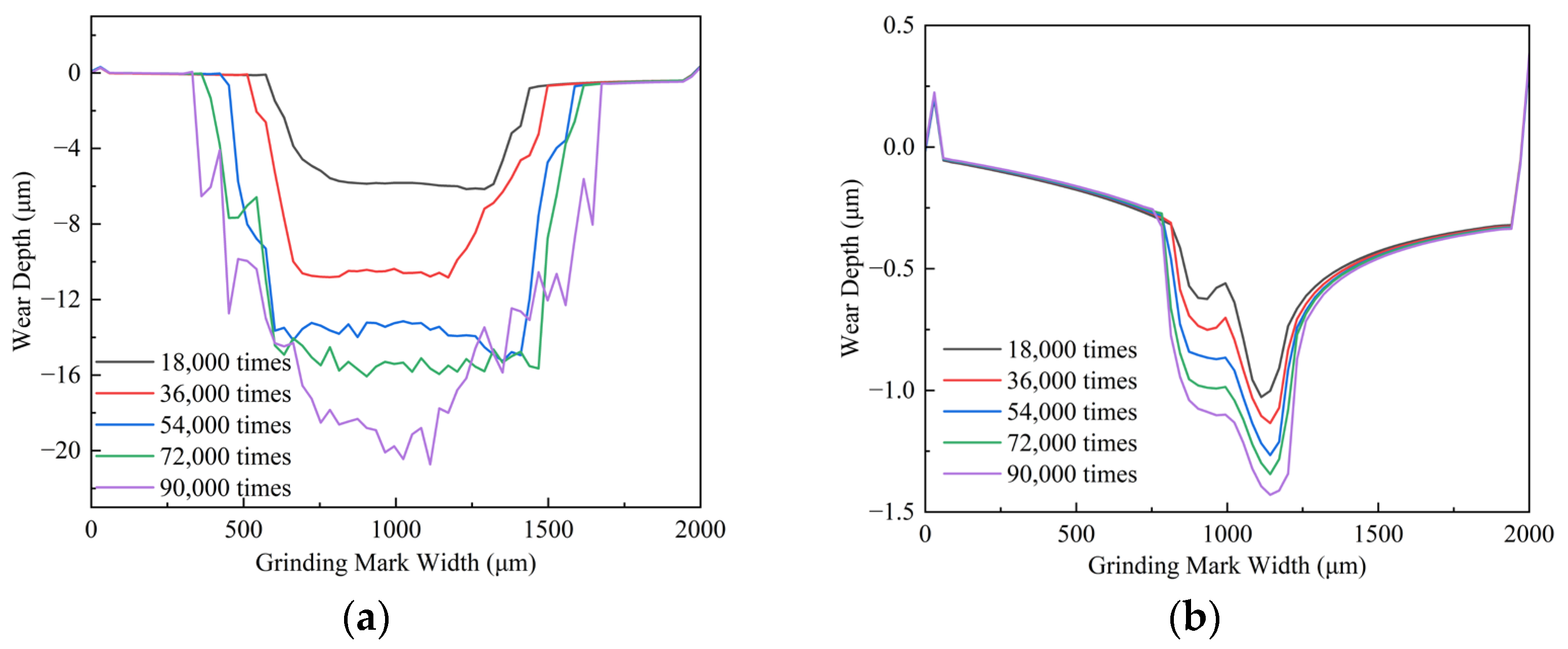 Figure 17. Comparison of raceway wear rates under uncoated and GLC-coated conditions at different cycle numbers. (a) Uncoated; (b) Coated.