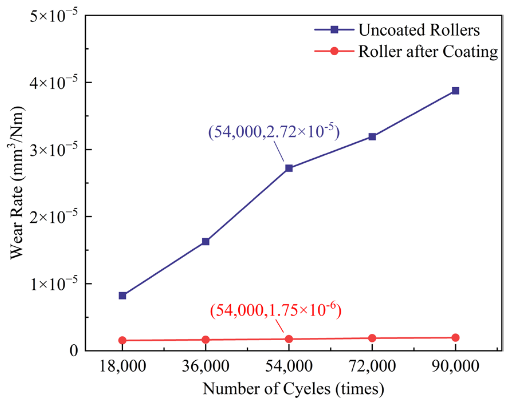 Figure 19 shows the variation in wear rate of the coated and uncoated roller–inner ring pairs under different cycle numbers. As observed in the figure, throughout the entire cycle range, the wear rate of the coated roller–inner ring pair remains at a low level, with only slight fluctuations as the number of cycles increases, indicating excellent stability. In contrast, the wear rate of the uncoated roller–inner ring pair shows a continuous upward trend with increasing cycle numbers, suggesting that surface damage accumulates progressively during the fretting process. This behavior is primarily attributed to the properties of the GLC film, including high hardness, low friction, and high adhesion strength. The high hardness effectively inhibits plastic deformation during fretting, while the low friction coefficient reduces interfacial shear stress, maintaining stable and controllable wear behavior. For the uncoated roller–inner ring pair, the absence of such protective properties exposes the surface directly to cyclic shear and stress. As the number of cycles increases, damage accumulates, resulting in a continuous increase in wear rate.